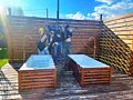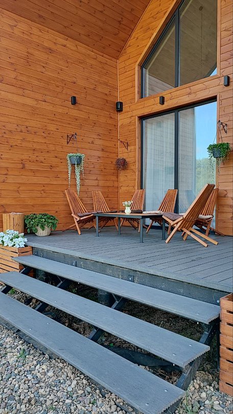 На территории вас ждет костровая зона (чаша, гриль решетка, шампура), детская площадка, баня на дровах (не входит в стоимость аренды), открытая веранда дома, и lounge зона c ваннами под открытым небом.