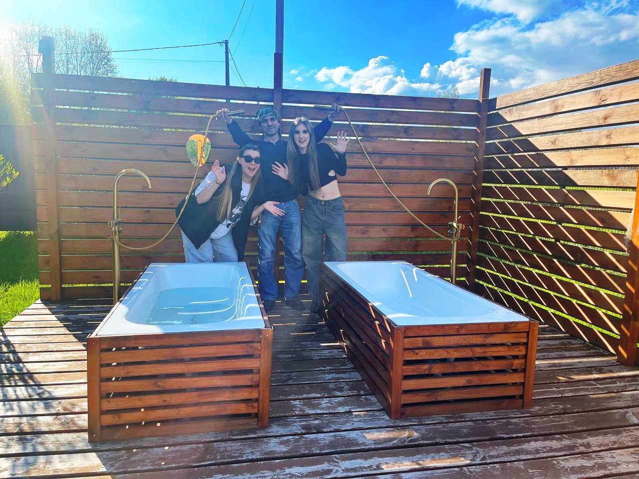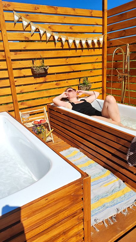Две ванны под открытым небом, оснащены горячей и холодной водой, в них можно расслабиться поздним вечером, или принять ванну утром, а может охладиться от жары жарким днем.
