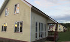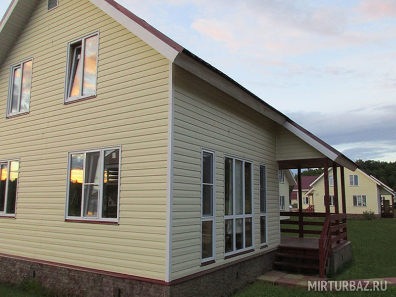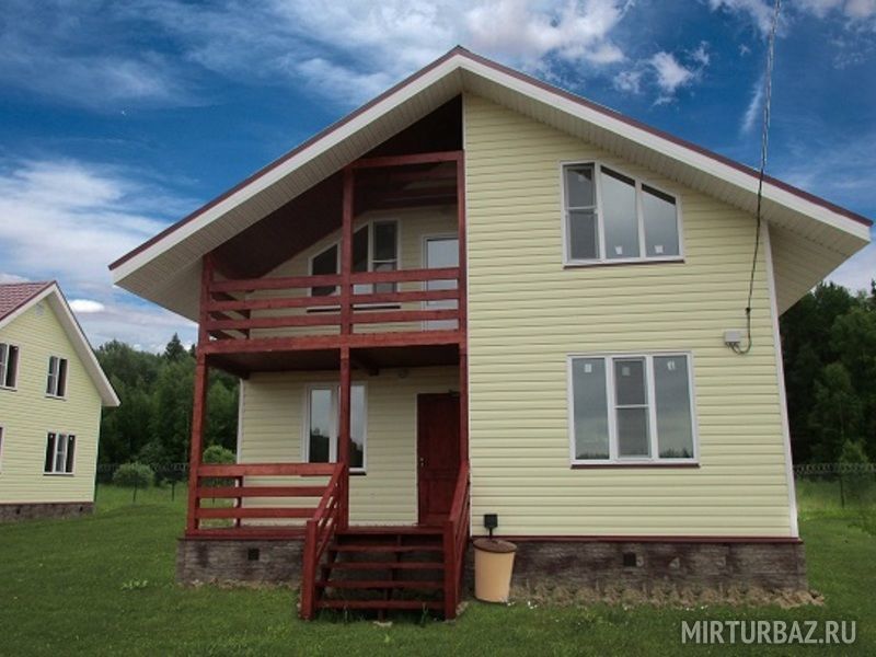 Большой коттедж с балконом — 5 домов. Рассчитан на 6-8 человек. Площадь дома 102 м2. Дом расположен на участке 8 соток. На первом этаже располагаются: крыльцо, тамбур, санузел, холл, спальня, кухня, большая и светлая гостиная, лестница на второй этаж в холле. На втором этаже находятся: холл, три спальни, санузел и балкон, на который можно попасть из холла.