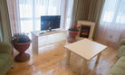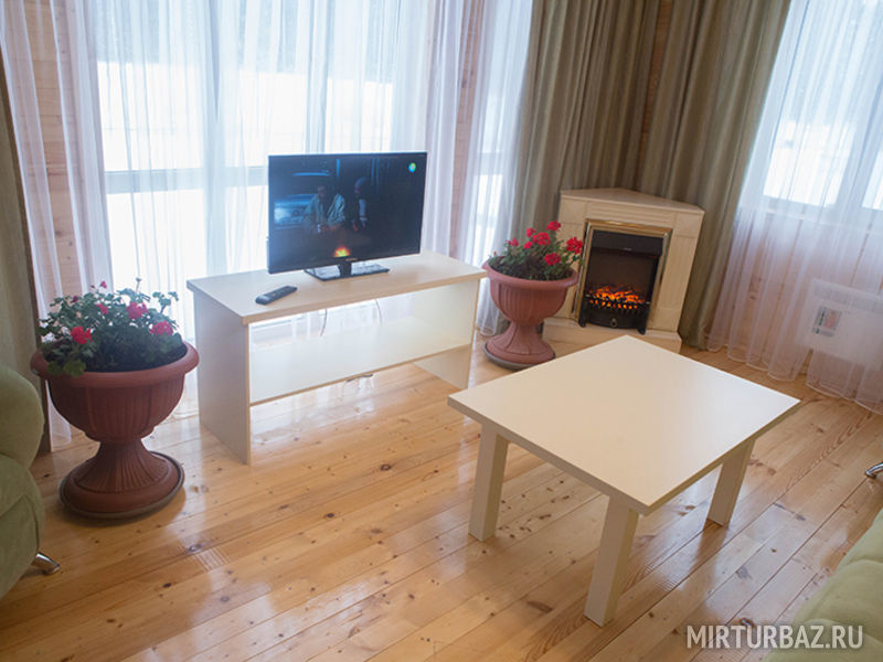 Гостиная оснащена мягкой мебелью, электрокамином и телевизором.