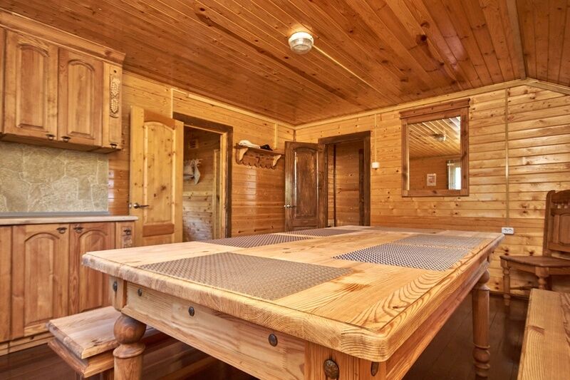 Сауна на дровах, есть большой предбанник с кухонным гарнитуром и огромным столом для отдыха в компании до 8 человек.