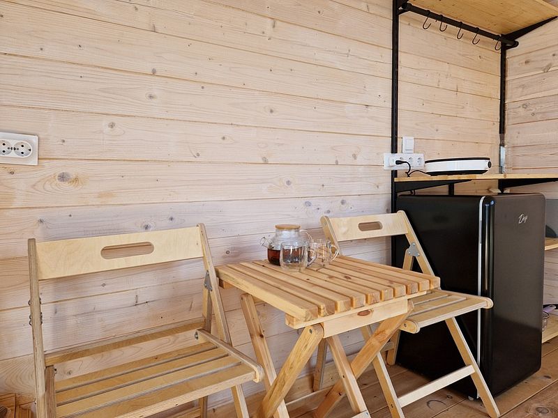 Уютный мини-дом для двоих включает в себя: панорамное окно, двуспальный матрас, санузел с душем, мини-кухню и необходимый набор посуды.