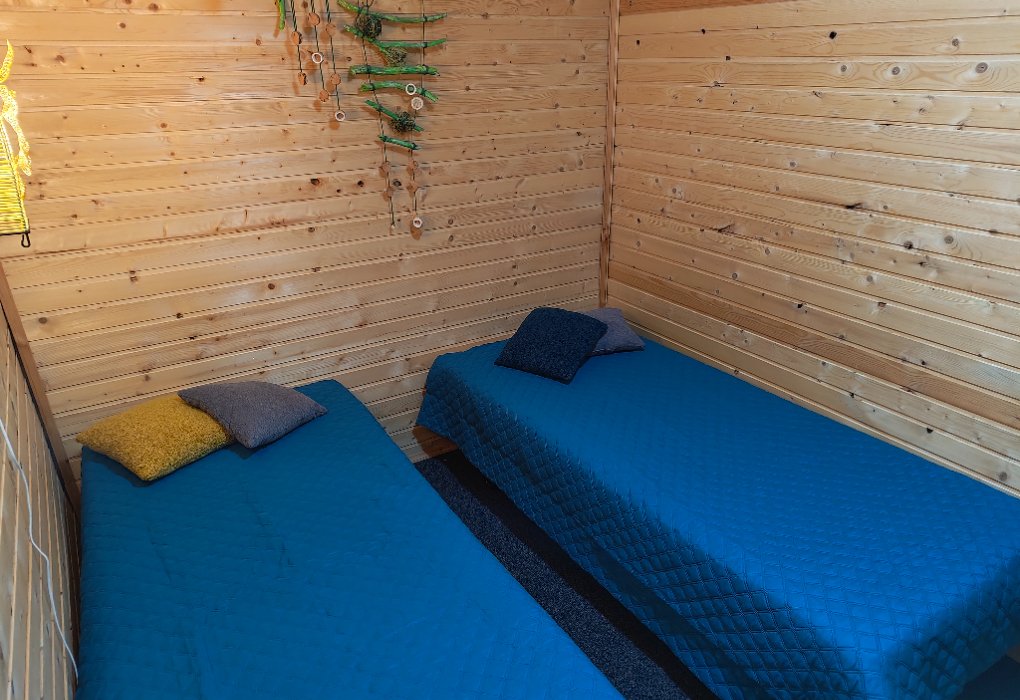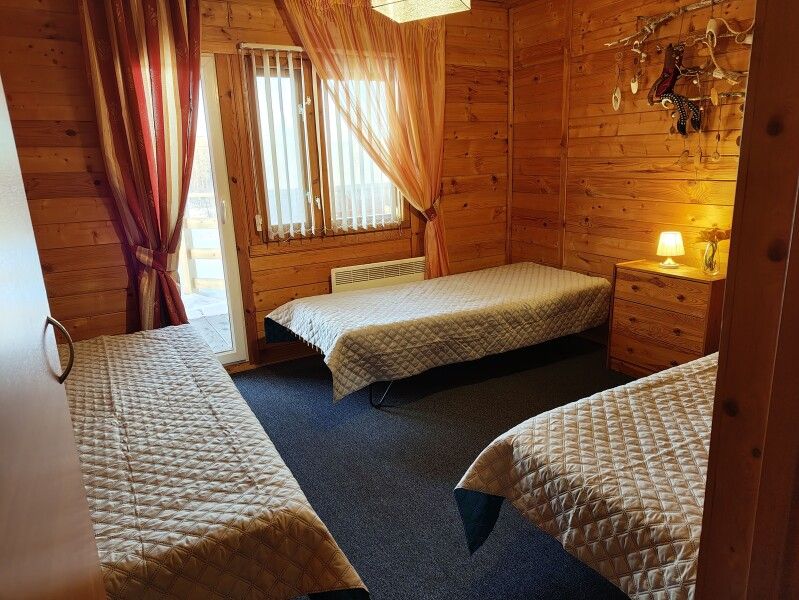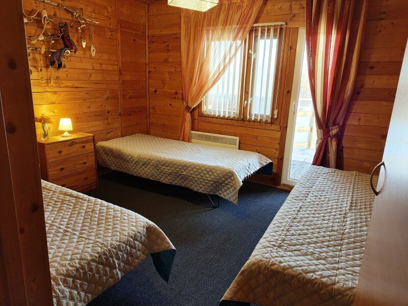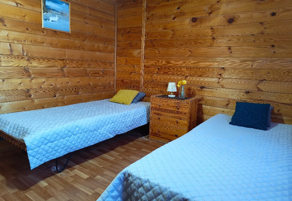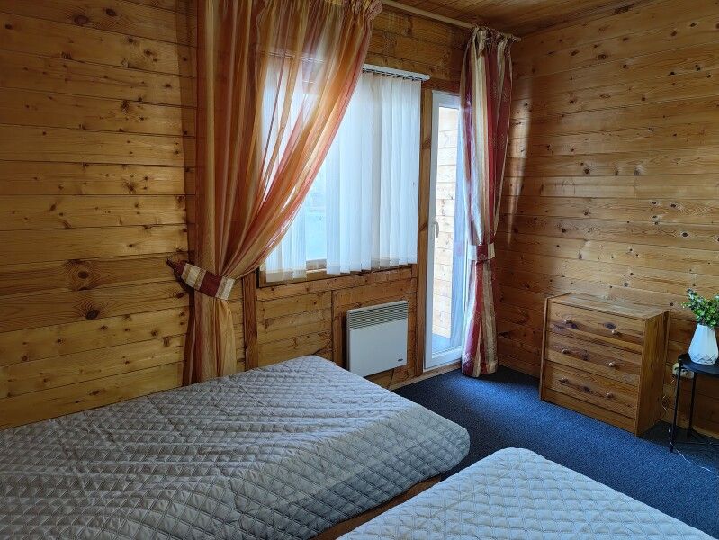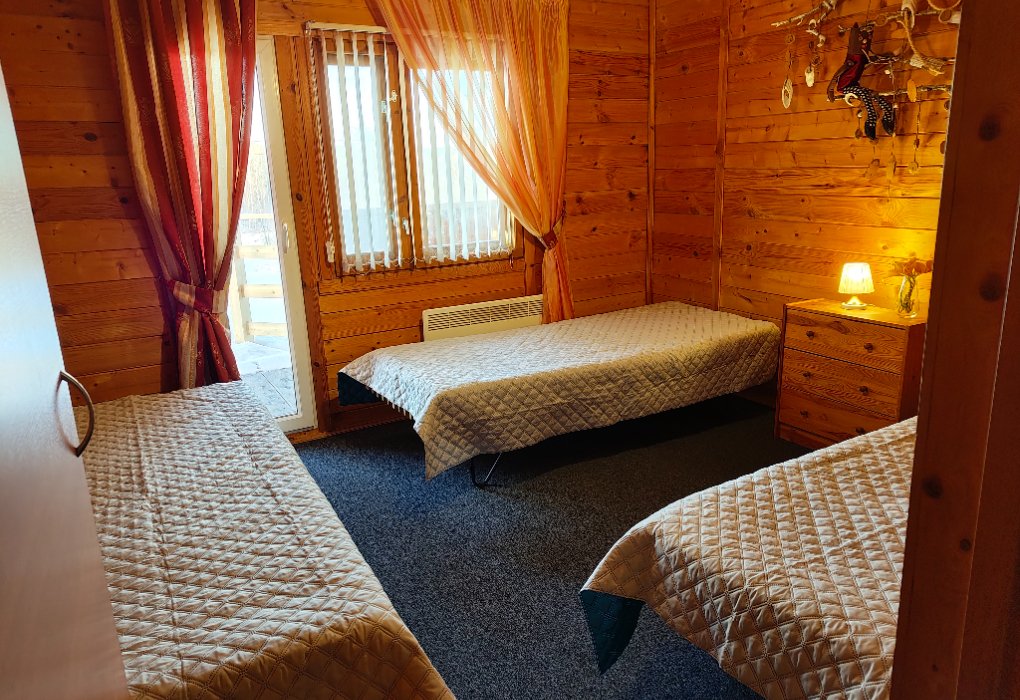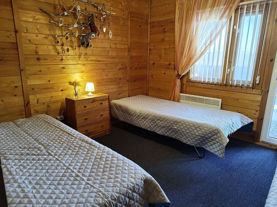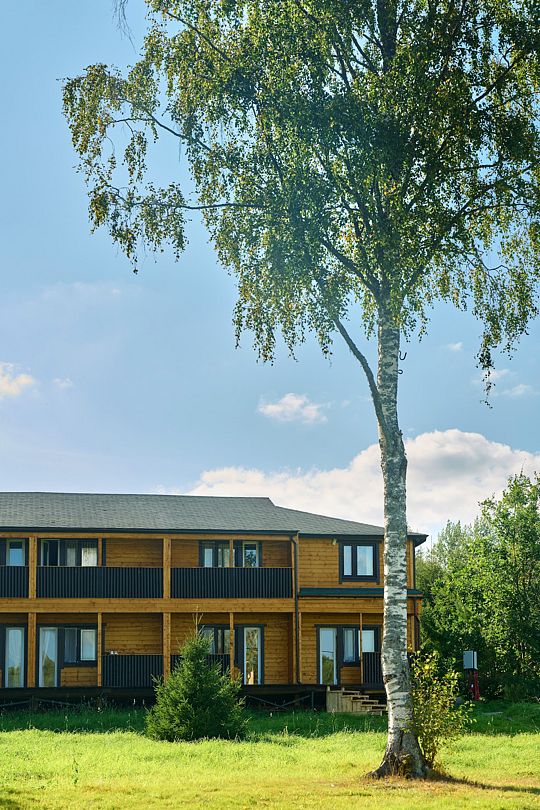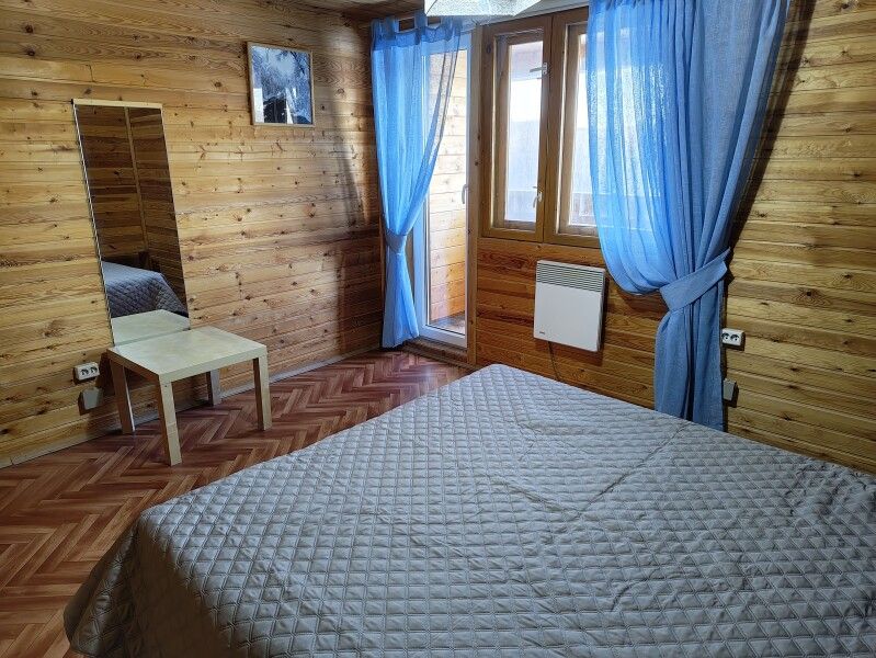 Номер на втором этаже с выходом на балкон. Вид на лес и озеро, состоит из трех комнат и кухни-студии. Первая комната — двуспальная кровать, вторая комната — три односпальных кровати. Диван двуспальный в кухне-гостиной — дополнительные места.