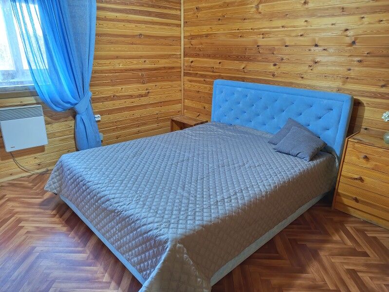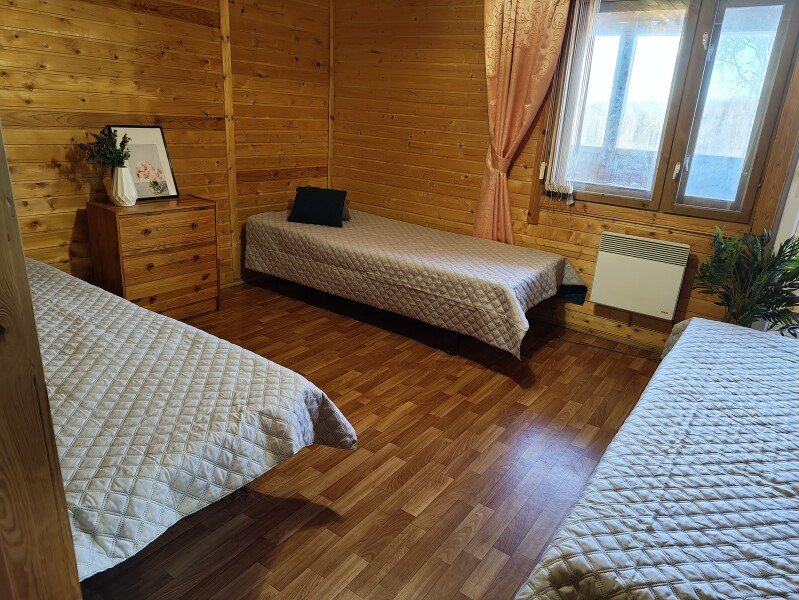 Номер на втором этаже с выходом на балкон. Вид на лес и озеро, состоит из трех комнат и кухни-студии. Первая комната — двуспальная кровать, вторая комната — три односпальных кровати, третья комната — две односпальные кровати. Диван двуспальный в кухне-гостиной — дополнительные места.