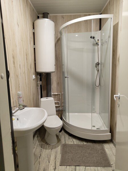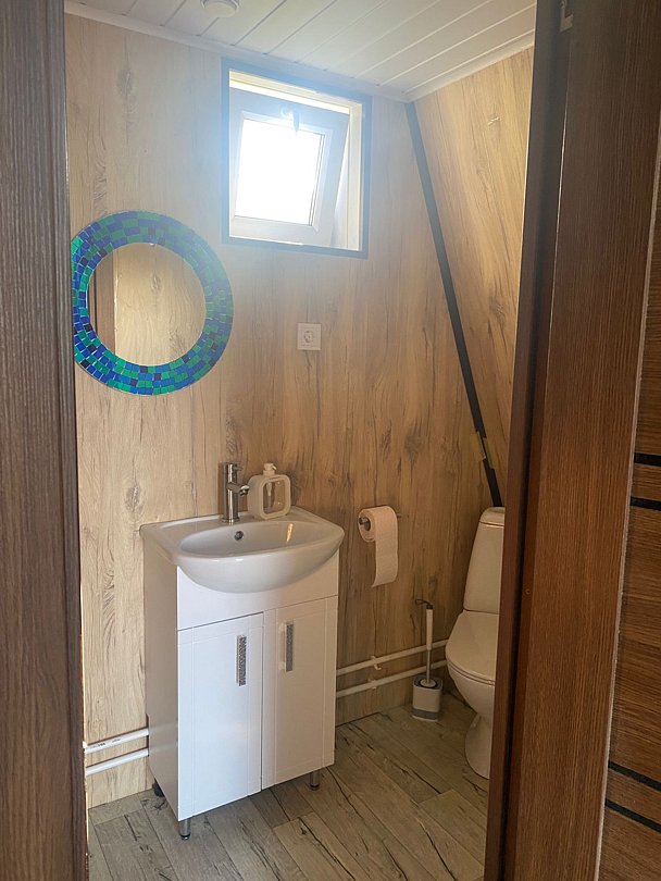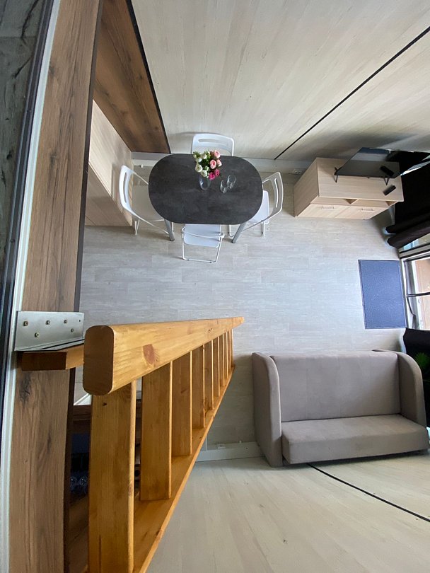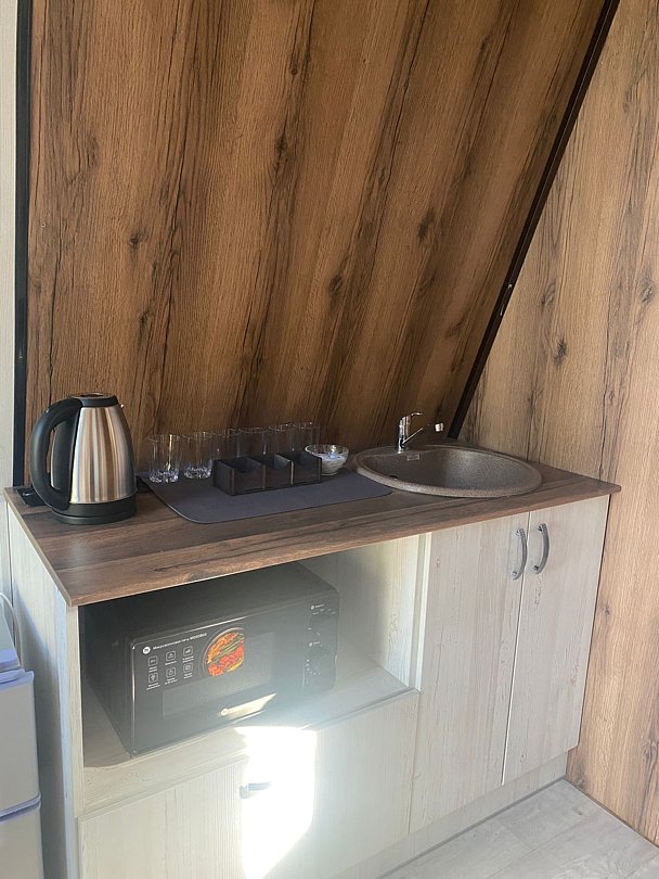 На первом этаже вы найдете кухонный уголок, гостиную с просторным диваном, где можно не только покушать свои любимые блюда, но и проводить время в компании. Санузел обеспечен всем необходимым для удобства и комфорта.