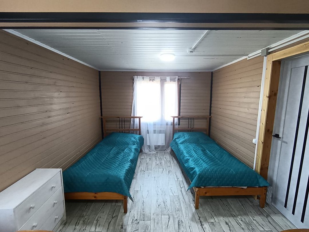 Первый этаж коттеджа состоит из двух больших комнат и кухни- студии. Первая комната — двуспальная кровать, вторая комната — три односпальных кровати. Диван двуспальный в кухне-гостиной — дополнительные места.