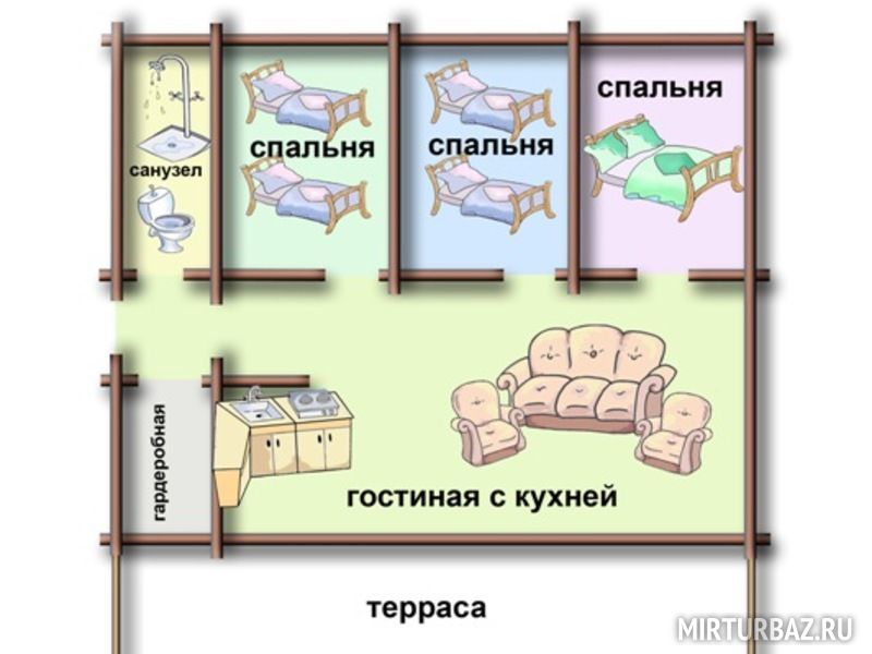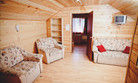 На первом этаже гостиная + кухня (холодильник, микроволновая печь, чайник, кофеварка, двухкомфорочная эл. плитка). ЖК- телевизор с домашним кинотеатром и караоке. Подключение к каналам Триколор ТВ. На раскладном диване возможны дополнительные места. Две спальни: одна с двуспальной кроватью, вторая спальня с полутороспальной и двуспальной кроватью. Душевая, туалет. Горячая вода (бойлер на 100 л).