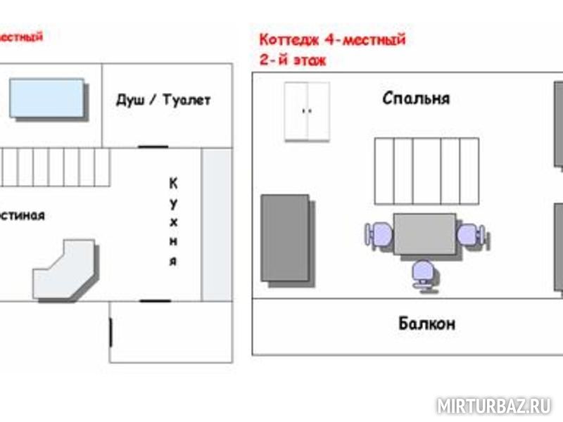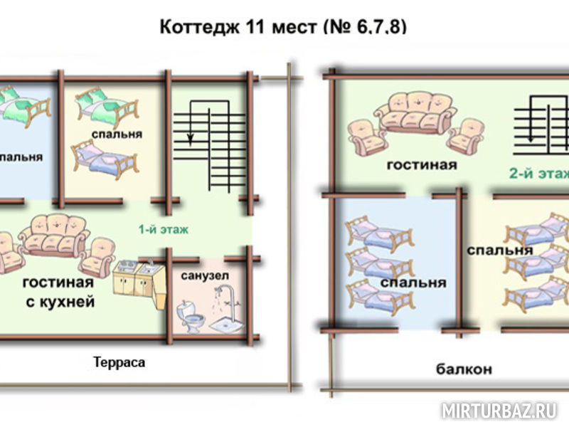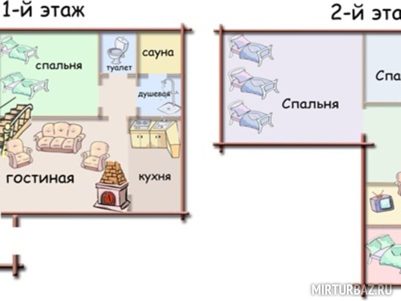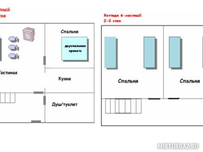 2-й этаж: 2 спальни. В каждой – 2 полутороспальные кровати.