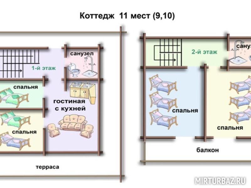 На втором этаже две спальни по 3 кровати. Душевая, туалет. Горячая вода (бойлер на 100 л). В коттедже полы с подогревом. Всего 11 мест + 1 раскладной дивана.