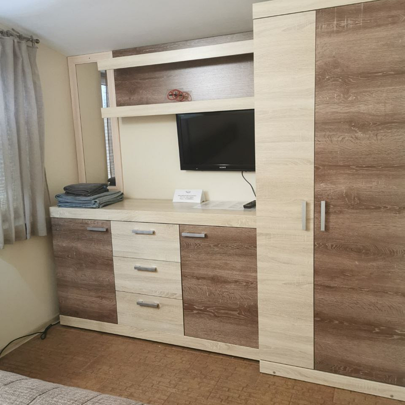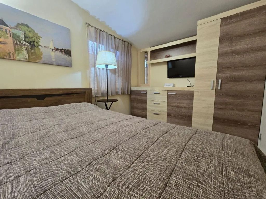 В спальне двуспальная кровать 160 см, шкаф, телевизор. В миниспальне двуспальная кровать 140 см. В ванной комнате душевая кабина, унитаз, раковина, стиральная машина, фен.