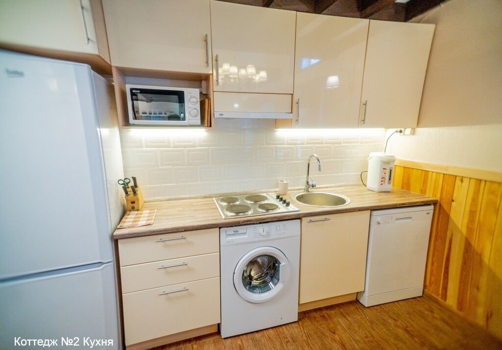 - оборудованная кухня (холодильник, электроплита, СВЧ, термопот, посудомоечная и стиральная машины);