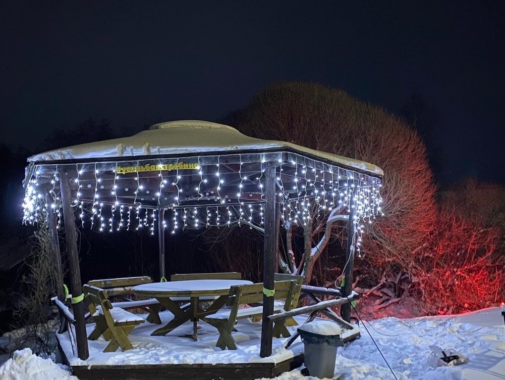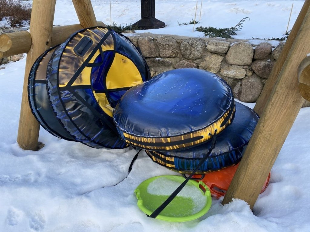 На территории отсутствуют заборы, есть спортивная площадка, мангальная зона, большая терраса. Гости могут заняться рыбалкой или зимой покататься на ватрушках.