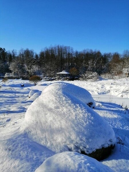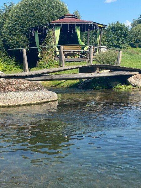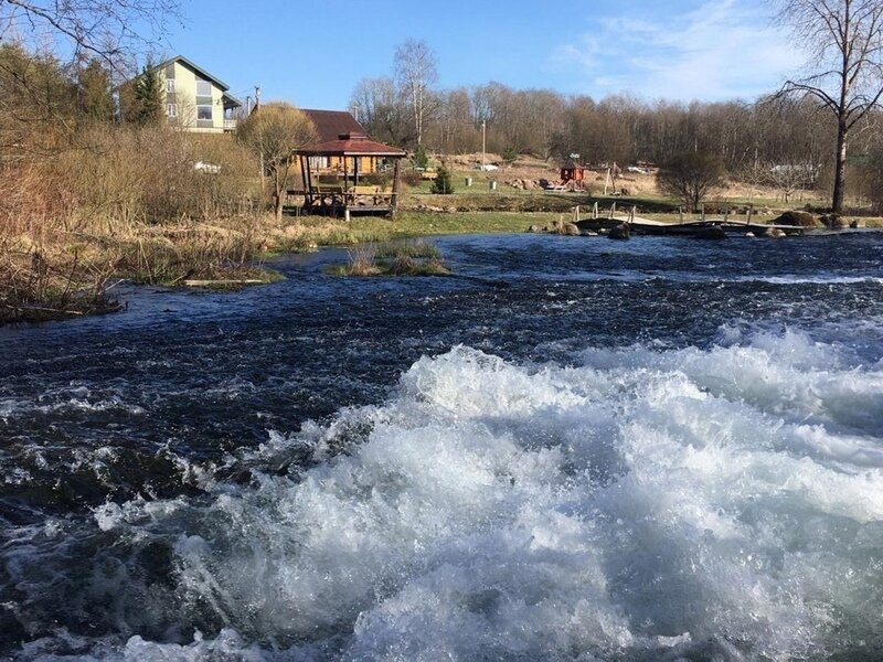 Огромная территория с чистейшей родниковой рекой, где есть большая беседка, мангальная зона и пляж, который не замерзает.