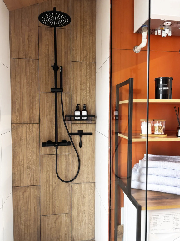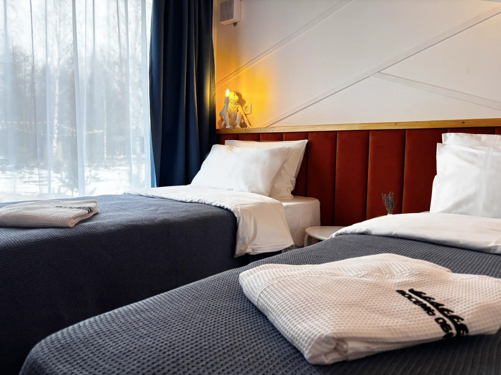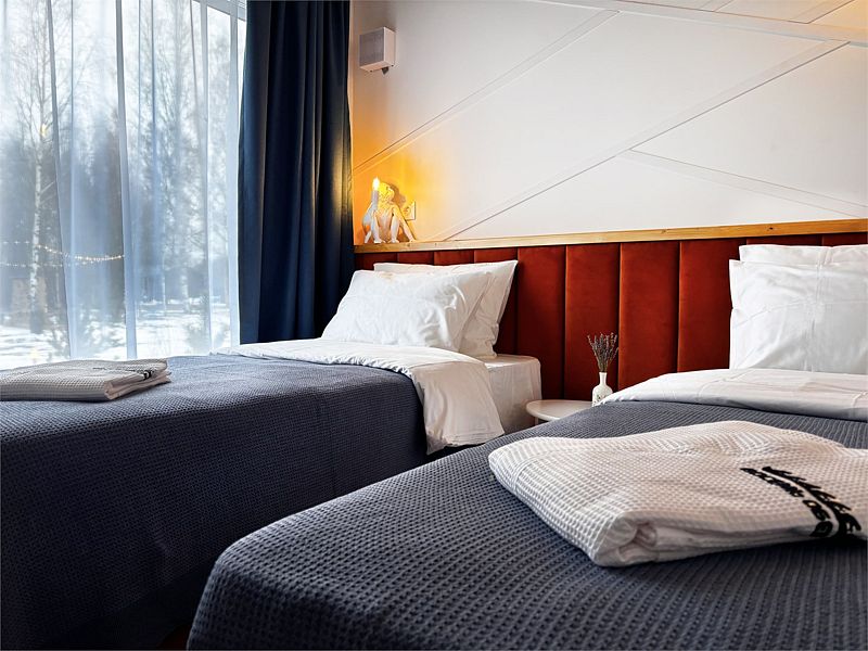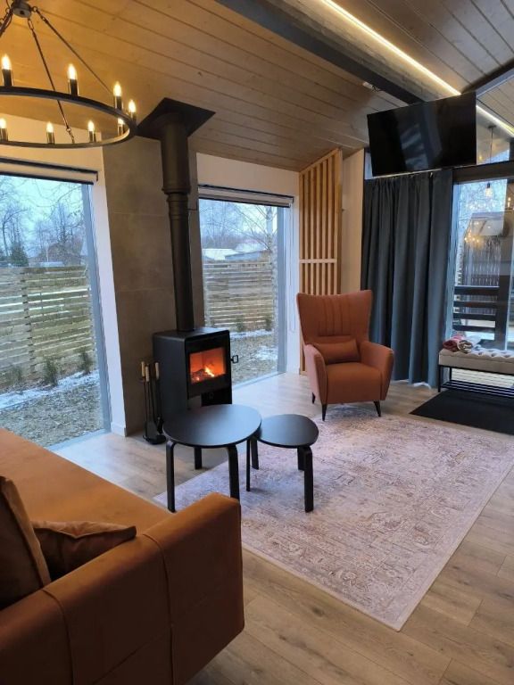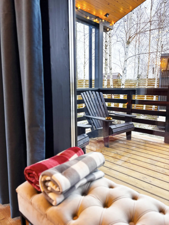 Для вас доступны две изолированные спальни с двуспальной и двумя односпальными кроватями (конфигурация кроватей трансформируется по вашему желанию), кухня-гостиная с полностью укомплектованной кухней, обеденным столом, раскладной диван с возможностью размещения двоих человек, камин, санузел с душевой кабиной и крытая терраса с встроенной дровяной купелью.