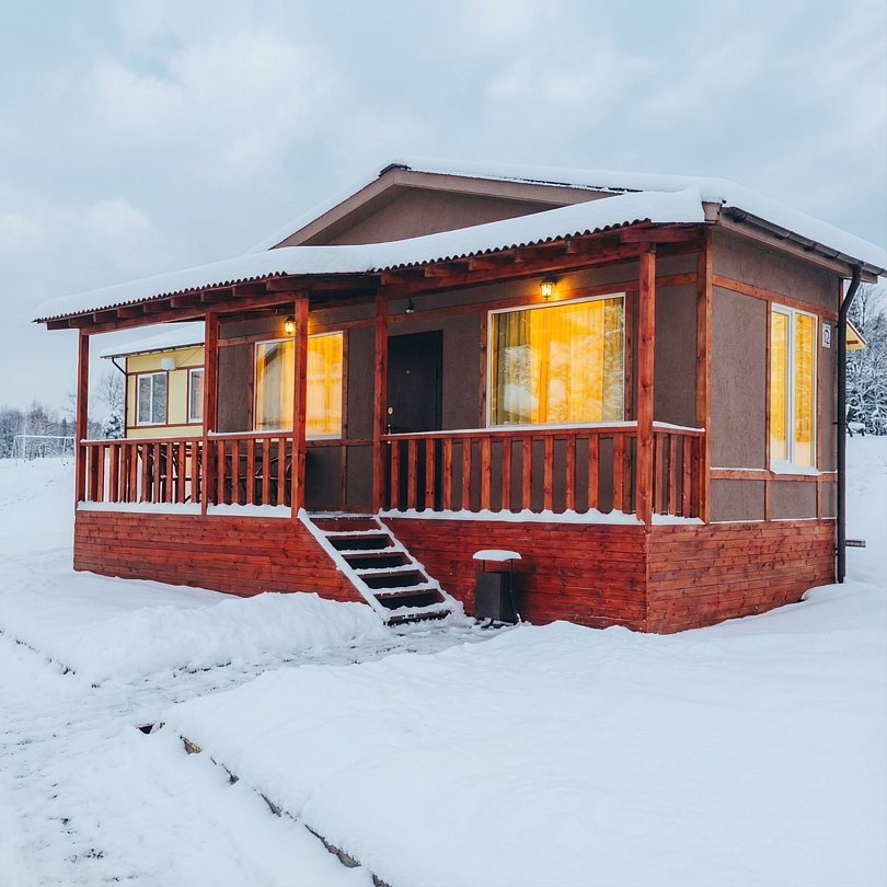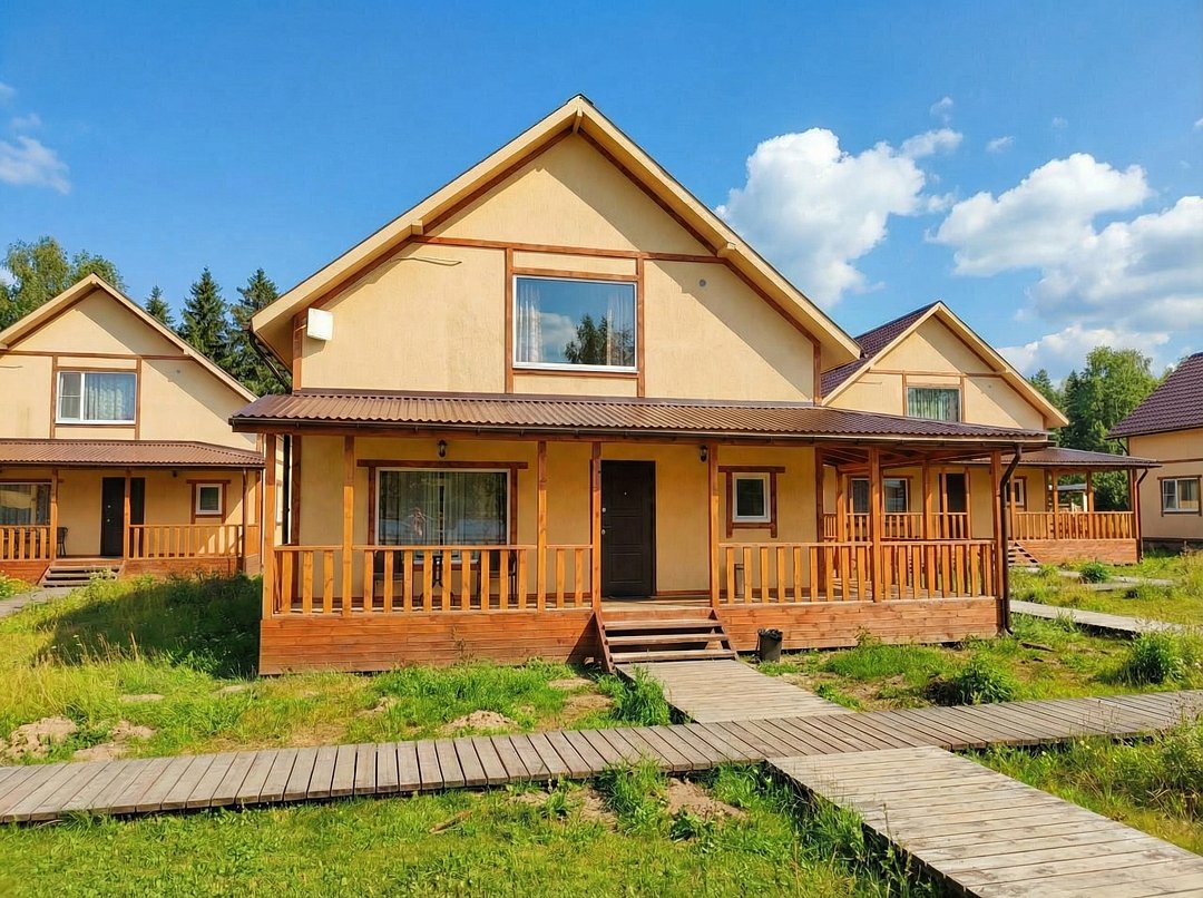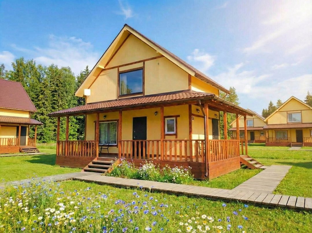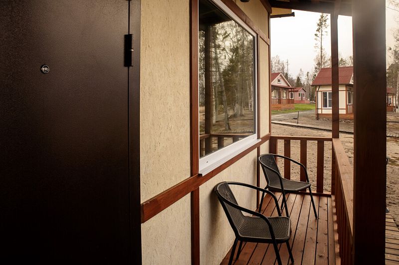 Трехкомнатный дом с верандой — двухэтажный дом, рассчитанный на комфортное размещение четырех гостей, с возможностью добавить два дополнительных места. Первый этаж: изолированная спальня (двуспальная кровать или две односпальные), гостиная зона с раскладным диваном (150х200), прихожая и ванная комната с душевой кабиной.