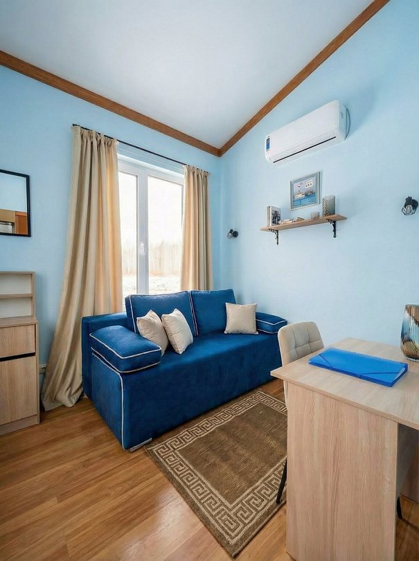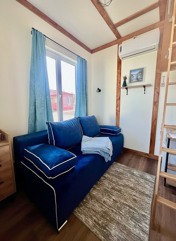 Комфортабельный четырехместный одноэтажный дом с продуманной планировкой. Вместимость: четыре основных места. Спальня: на ваш выбор — одна двуспальная кровать или две односпальные. Гостиная: большой раскладной диван (ширина спального места 150х200). Удобства: собственная прихожая, санузел с душевой кабиной. - Особенность: открытая веранда для отдыха.