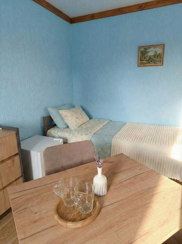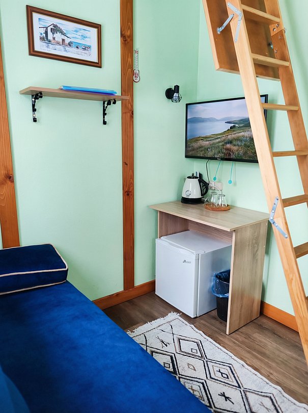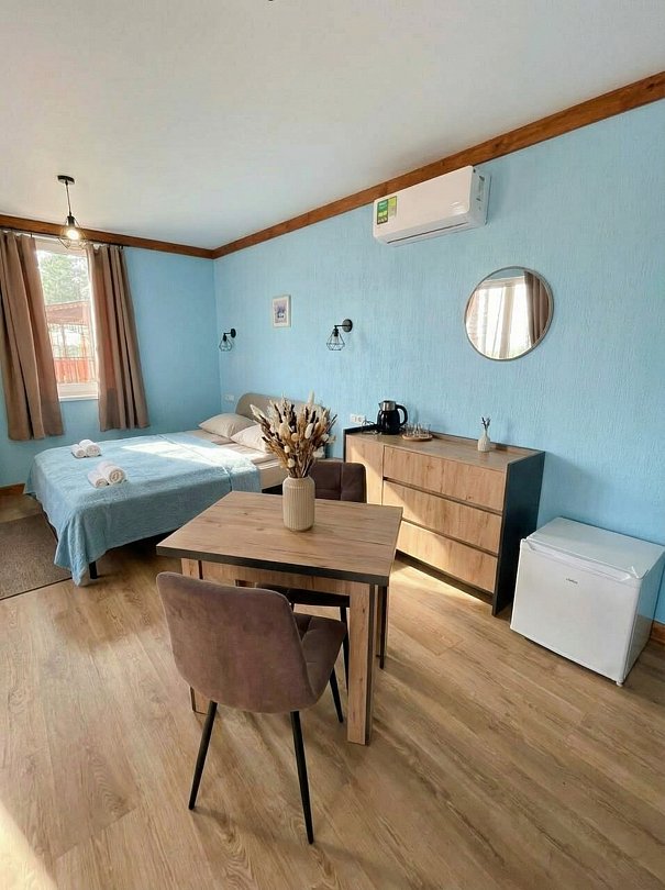 Однокомнатный просторный номер с отдельным входом и верандой на верхнем уровне. Расположение: второй этаж, отдельный вход с бокового фасада. Вместимость: два основных места. Спальные места: двуспальная кровать или две односпальные (на выбор).