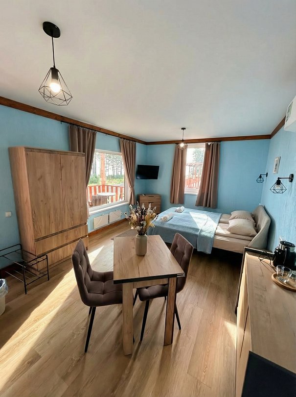 Однокомнатный просторный номер с отдельным входом и собственной верандой. Расположение: первый этаж, вход с центрального фасада. Вместимость: два основных места + одно дополнительное.