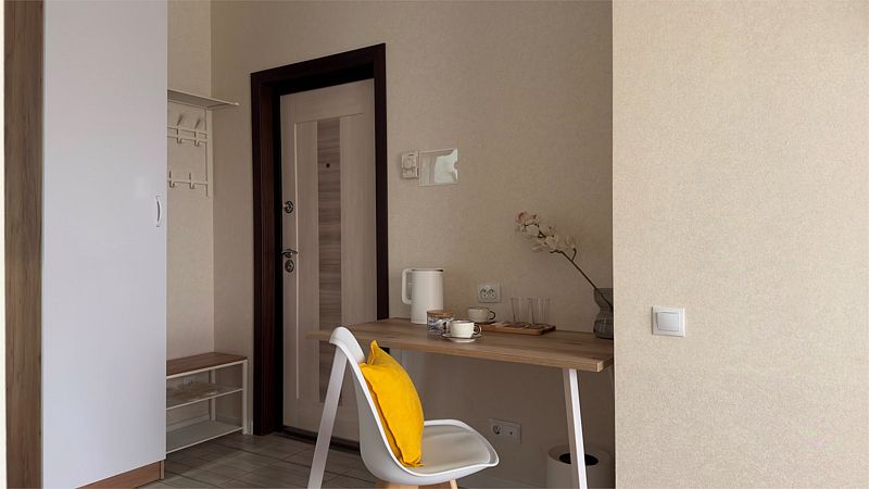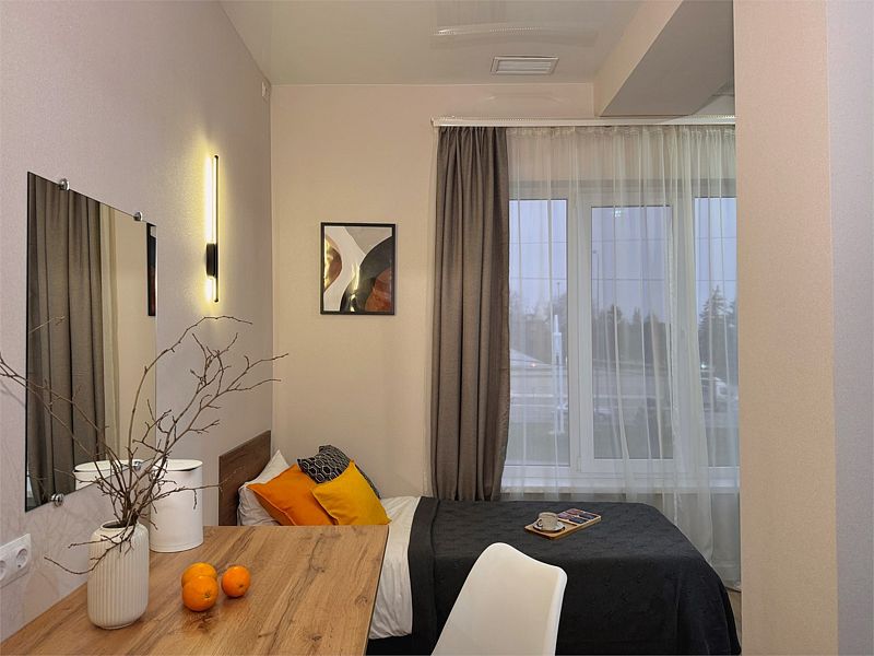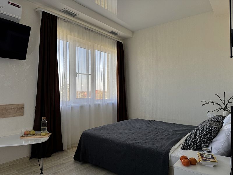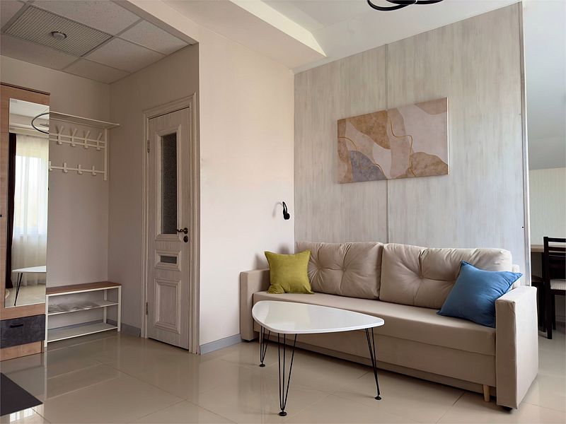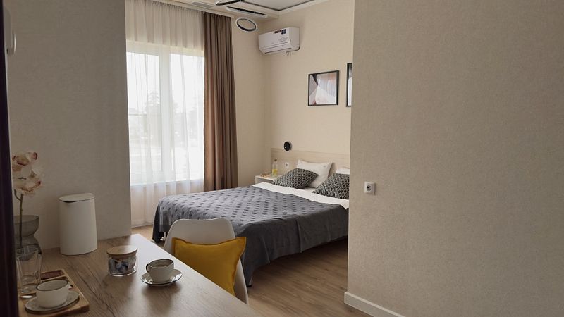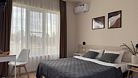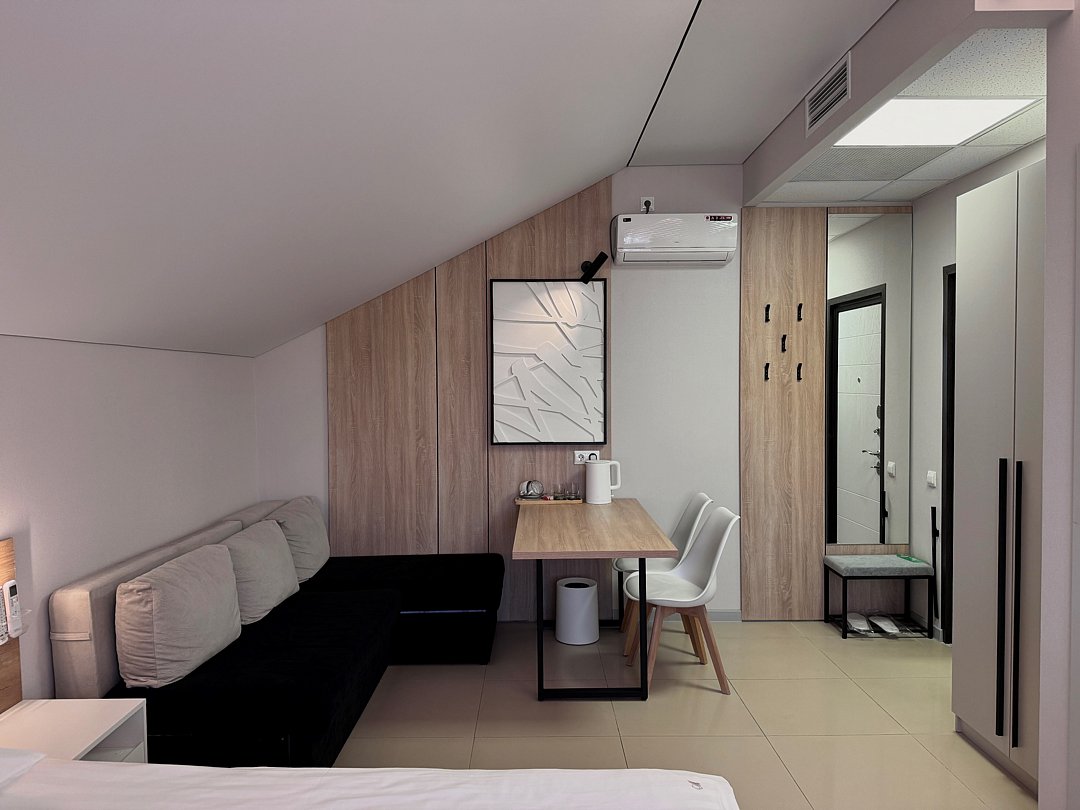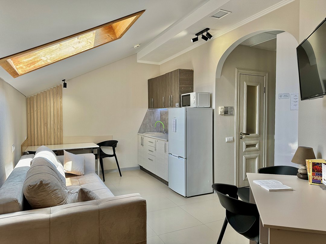 Просторный однокомнатный номер с двуспальной кроватью, двухместным раскладным диваном, раскладным креслом и кухонной зоной.