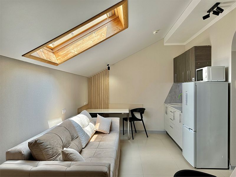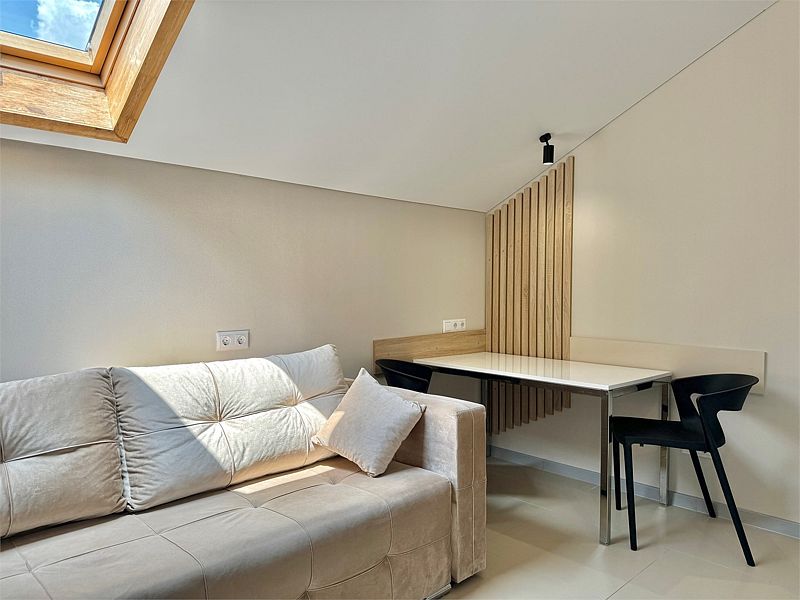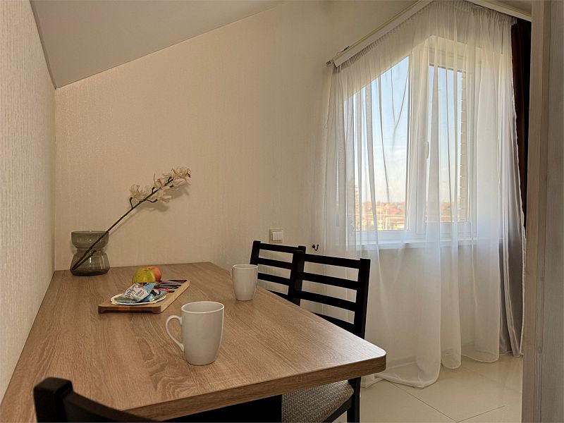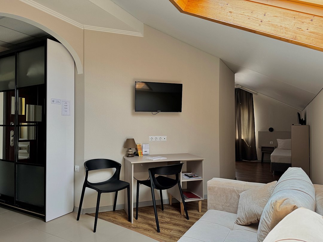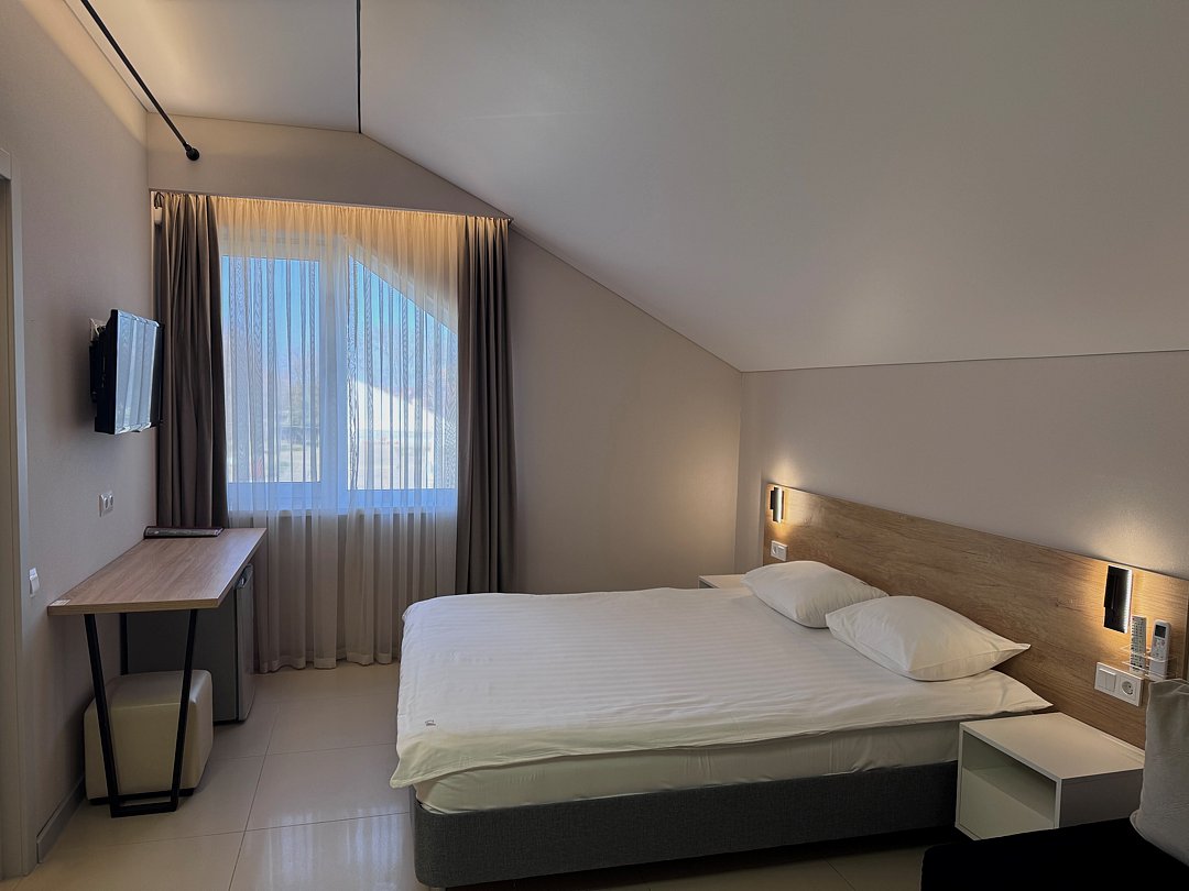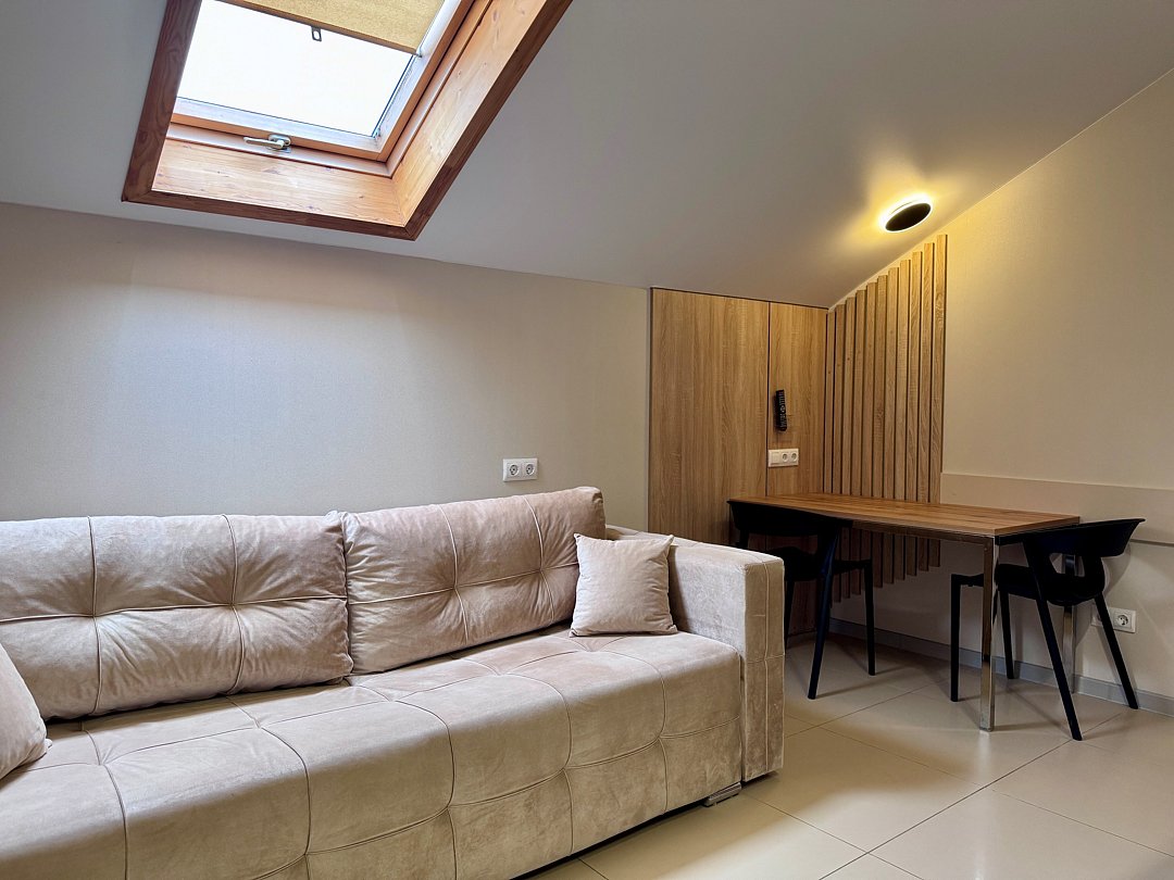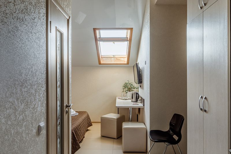 Уютный однокомнатный номер с двуспальной или двумя односпальными кроватями с мансардным окном.