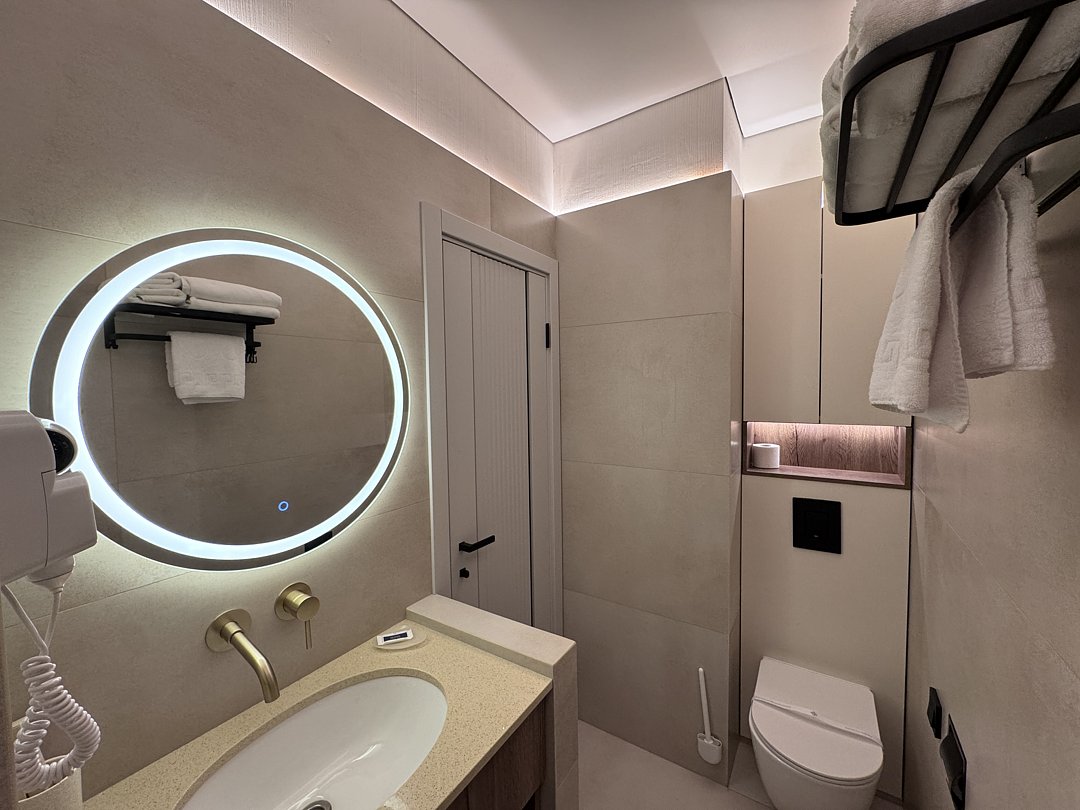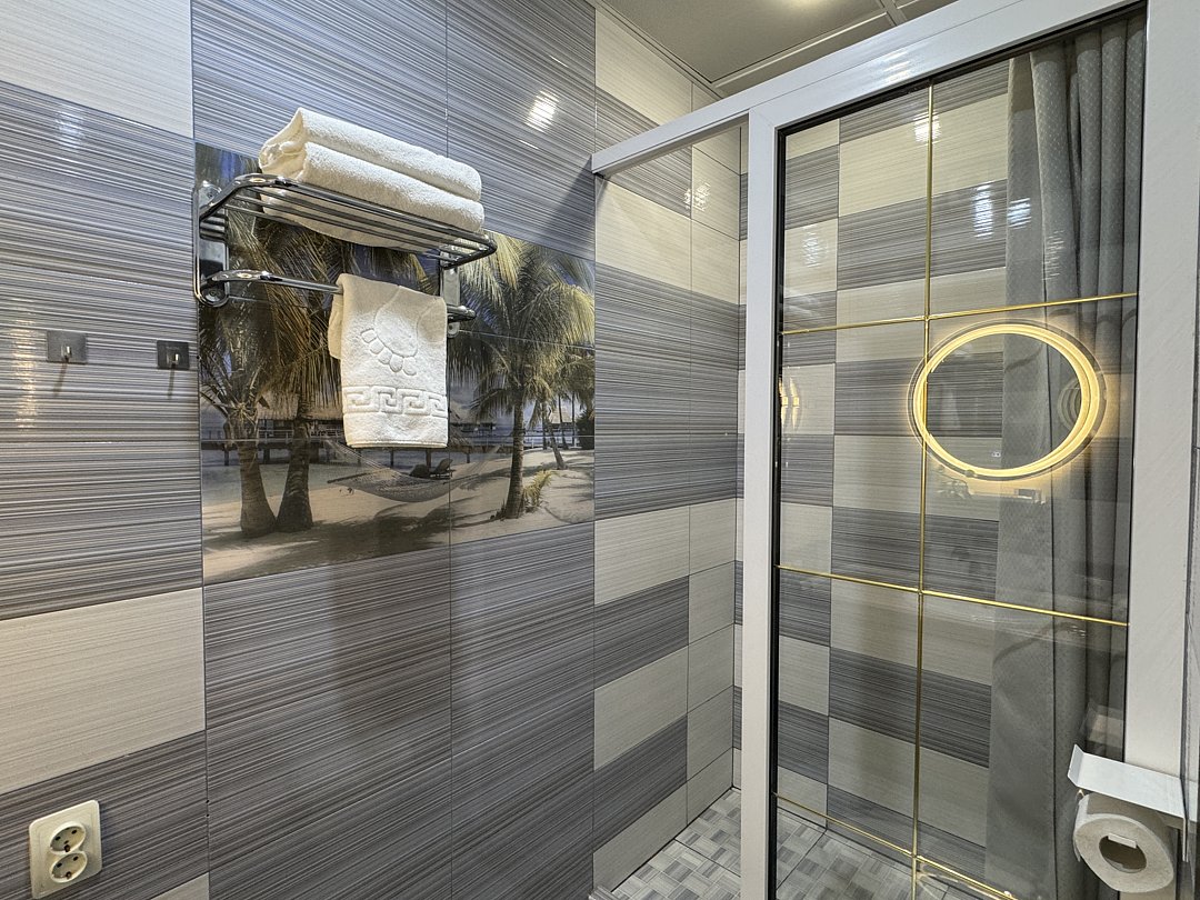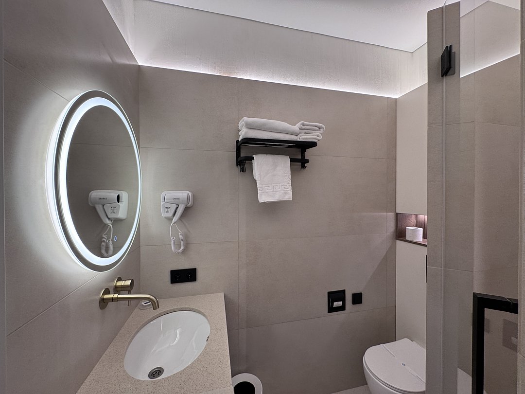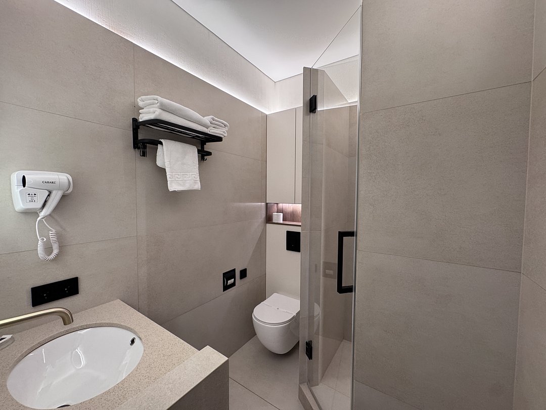 Из минусов: напор воды оставляет желать лучшего, неудобно завтракать в номере, на фоне свежести номера очень бросается в глаза ржавая сетка для душевых принадлежностей.
