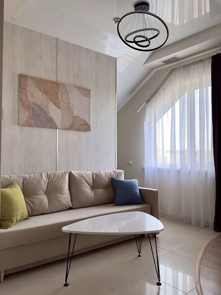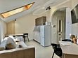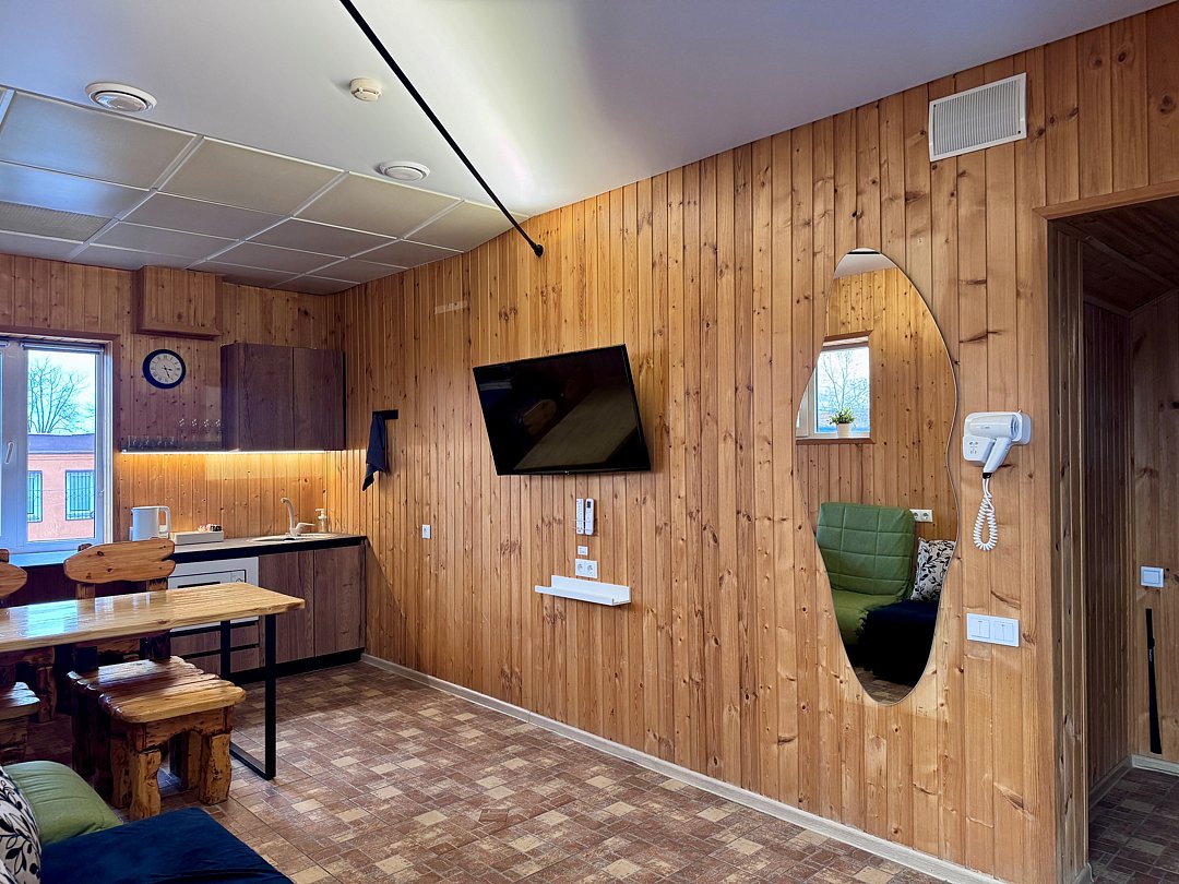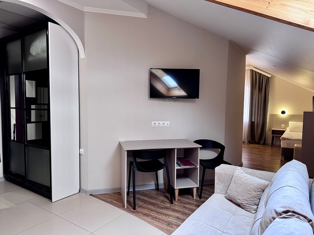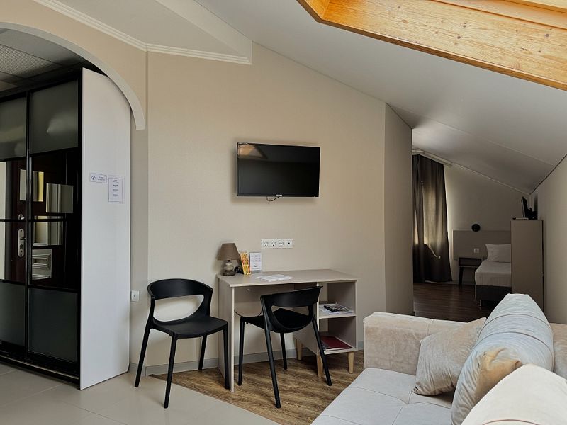 Просторный номер с двуспальной кроватью, двухместным раскладным диваном, раскладным креслом и кухонной зоной с обеденным столом, собственной сауной с бассейном.