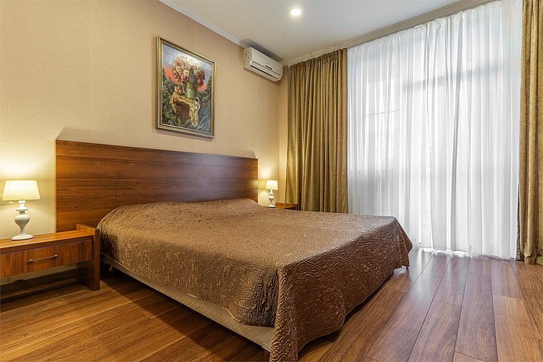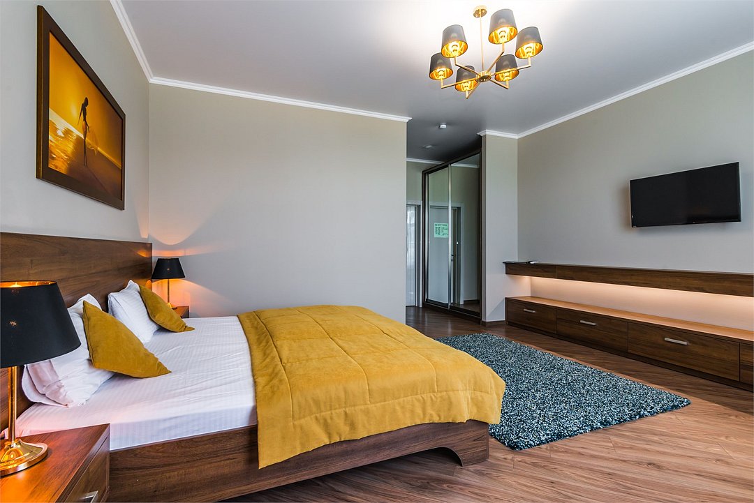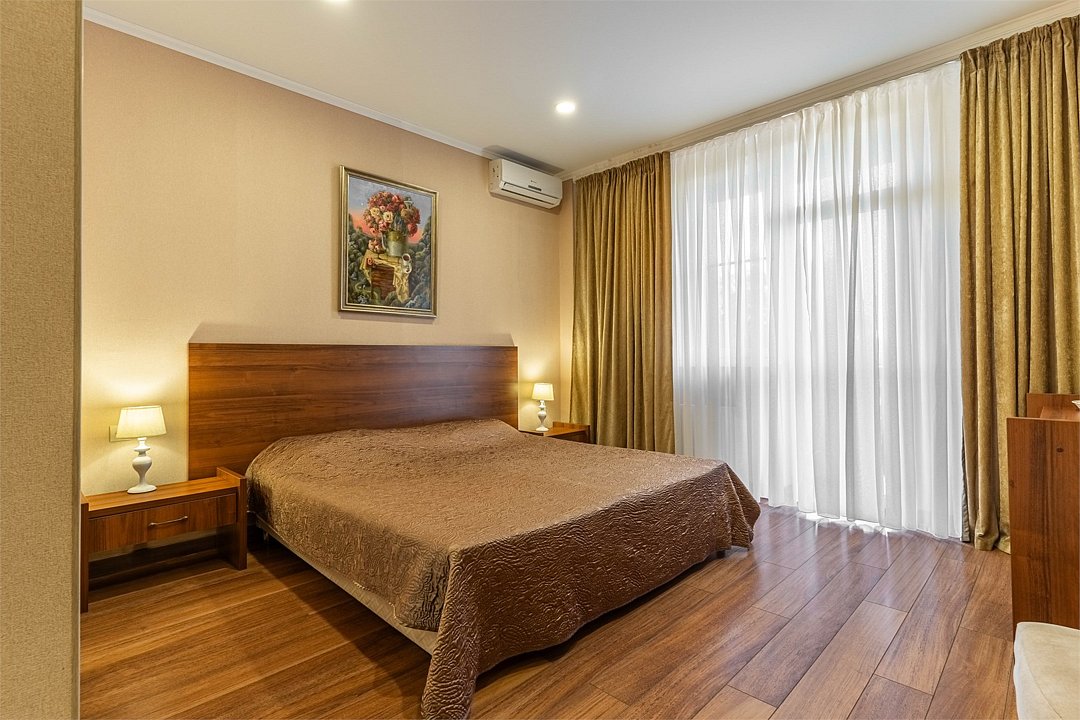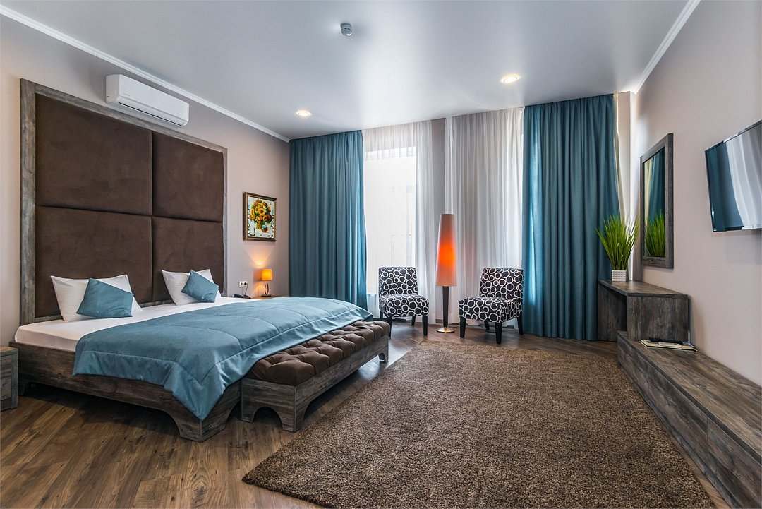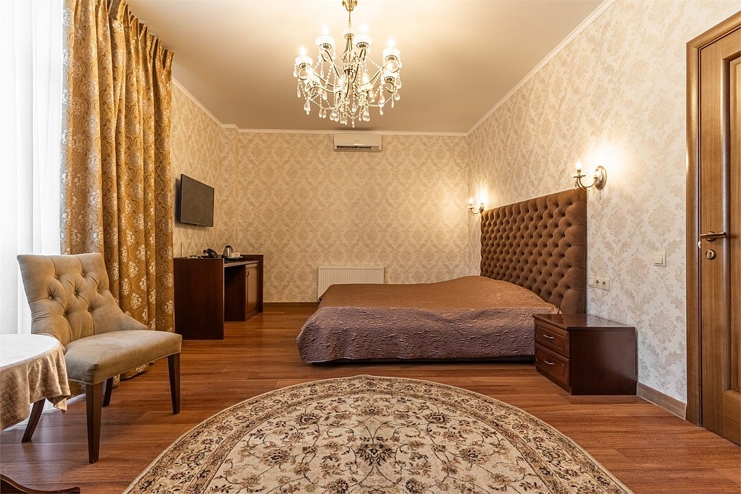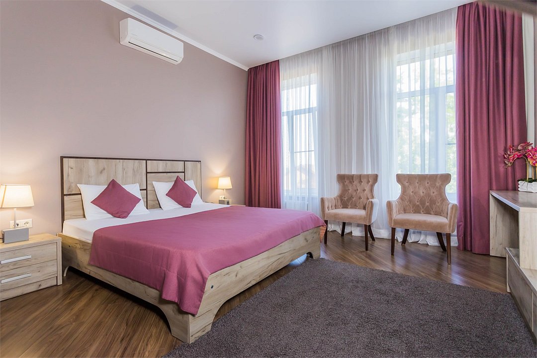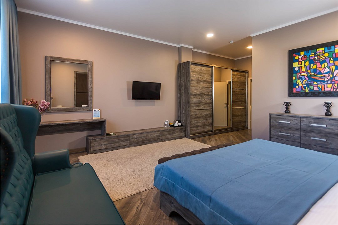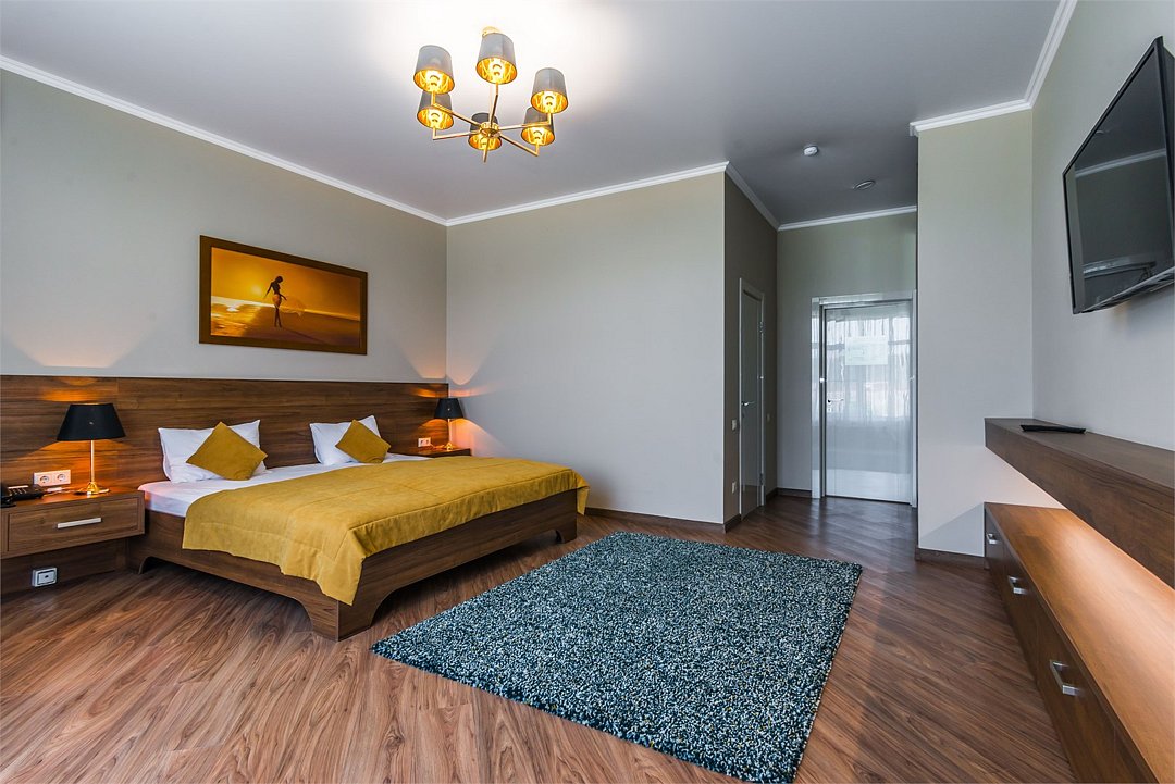 Номера ЛЮКС Роскошный, просторный и невероятно красивый - номер данной категории удовлетворит потребности даже самых взыскательных ценителей отдыха класса «Люкс»! Две комнаты: в одной огромная кровать, другая - укомплектована стильным диваном, который можно использовать в качестве дополнительного места, к примеру, если Вы отдыхаете с детьми! Просторная ванная комната. Благодаря огромным, панорамным окнам весь номер залит светом, но при желании легко создать полумрак благодаря плотным, стильным шторам из египетского хлопка! Просторный шкаф-купе поможет поддерживать в номере порядок - в нем поместятся все Ваши вещи! Проживание с животными запрещено!Услуги и удобства