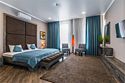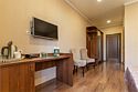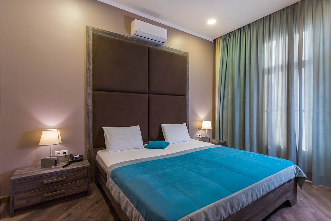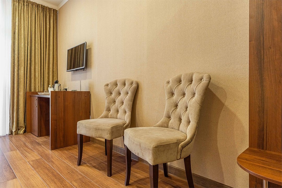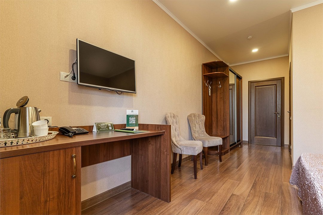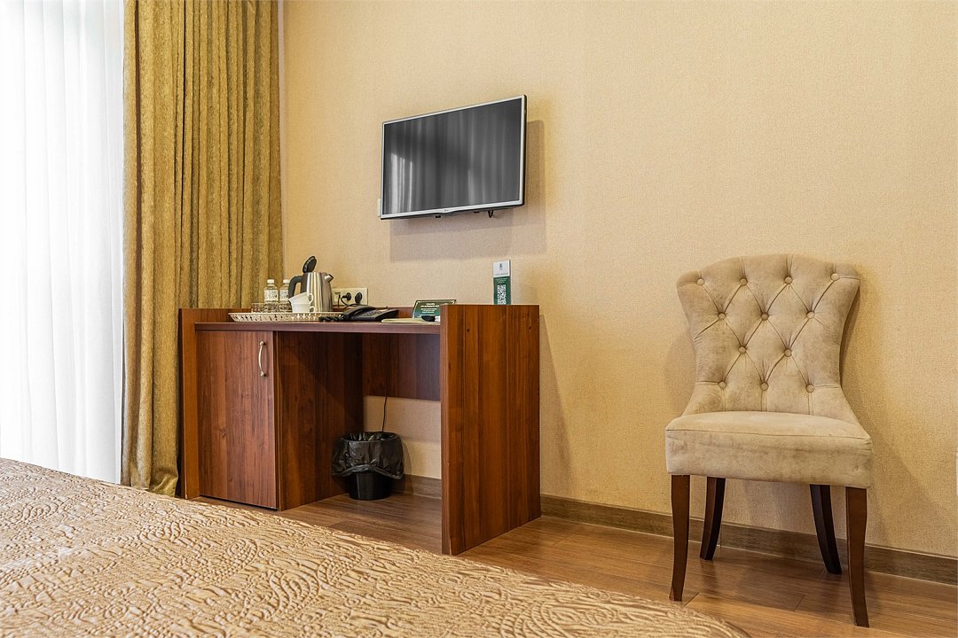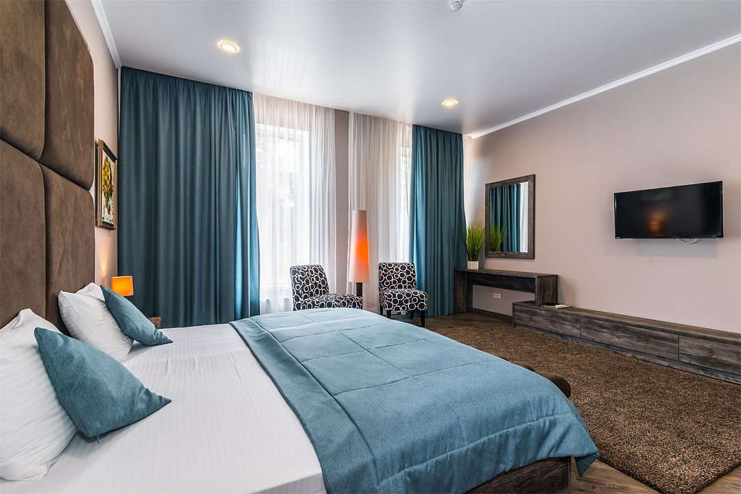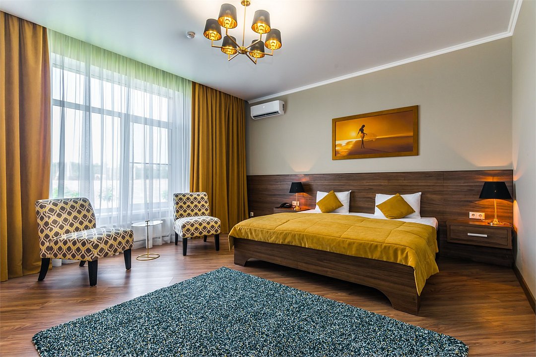Номер категории «полулюкс». Роскошный, просторный и невероятно красивый, подойдет для взыскательных гостей. Однокомнатный номер с европейским интерьером. Благодаря огромным, панорамным окнам весь номер залит светом, но при желании легко создать полумрак благодаря плотным стильным шторам из натурального хлопка. Просторная ванная комната. Вместительный шкаф-купе поможет поддерживать в номере порядок — в нем поместятся все ваши вещи. Проживание с животными запрещено!Услуги и удобства