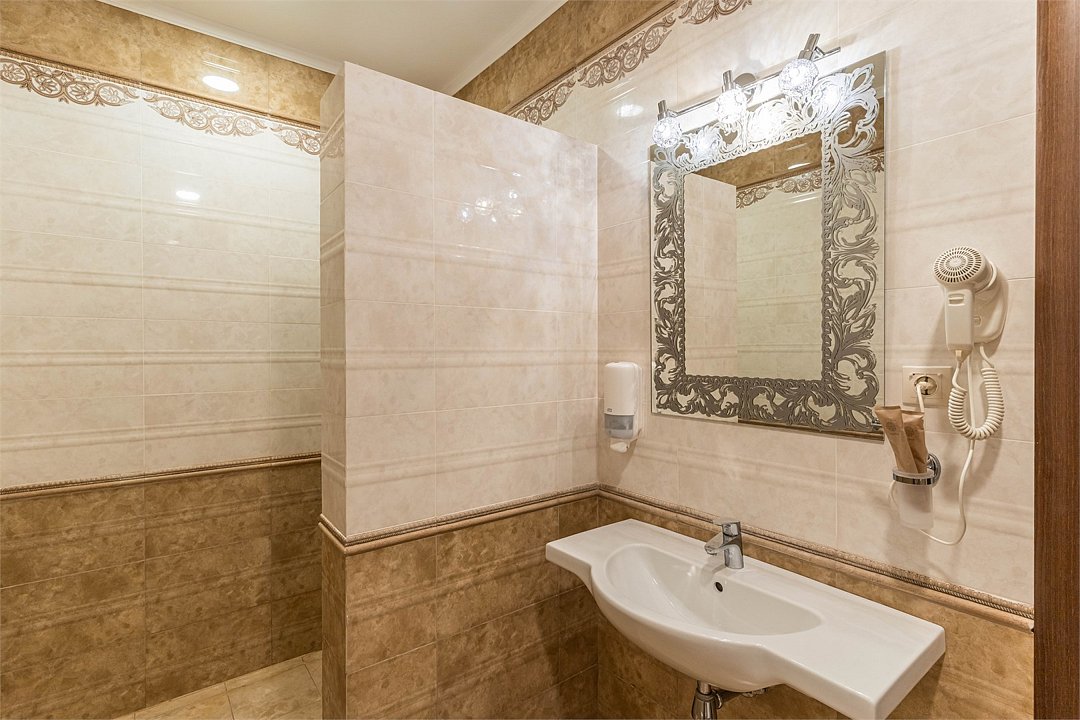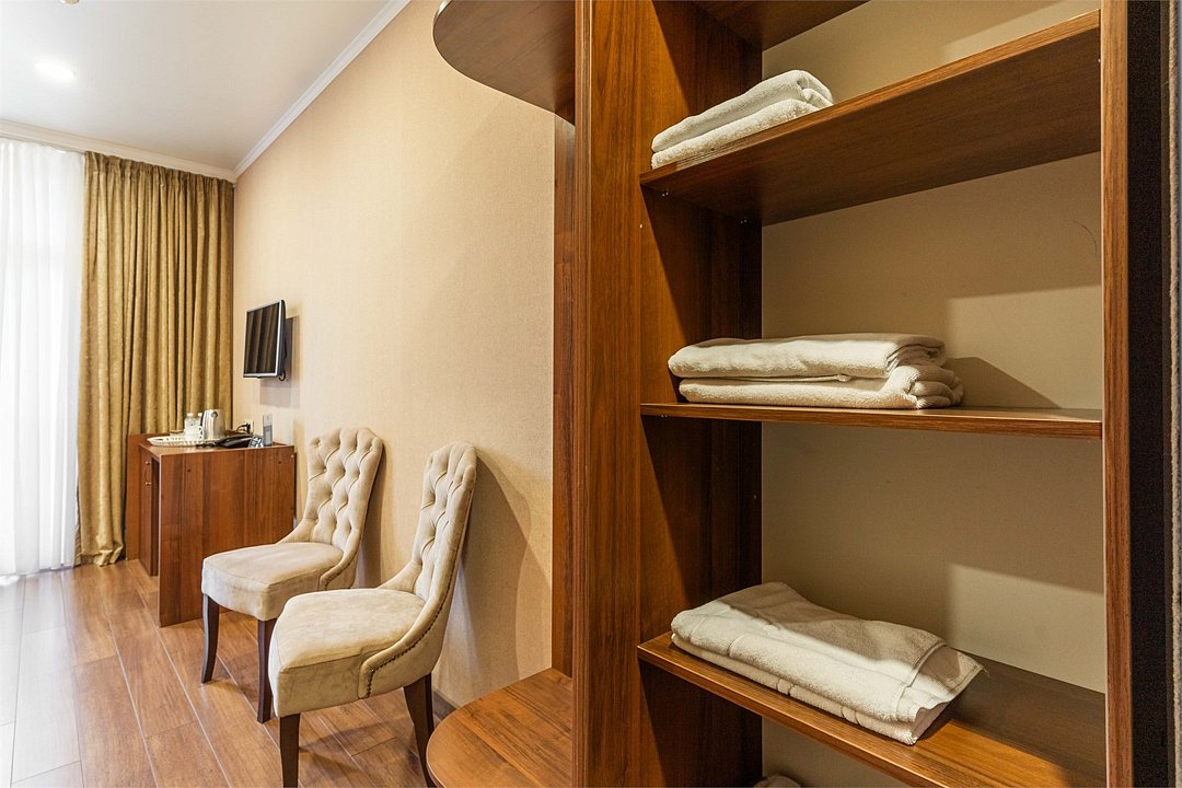 телевизор, Wi-Fi, фен, ванная комната, душевая кабина, халаты, тапочки, косметические средства, кровать «King size», тумбы, стулья, шкаф для одежды, вешалки, журнальный столик, зеркало, чайный набор, обслуживание номеров, чайник, раковина, кресло, стаканы, туалетные средства, туалет, сплит-система, внутренний телефон, мини-холодильник, шкаф-купе, общественный бассейн, уборка номера, бутилированная вода, мыло, без питомцевВ номере