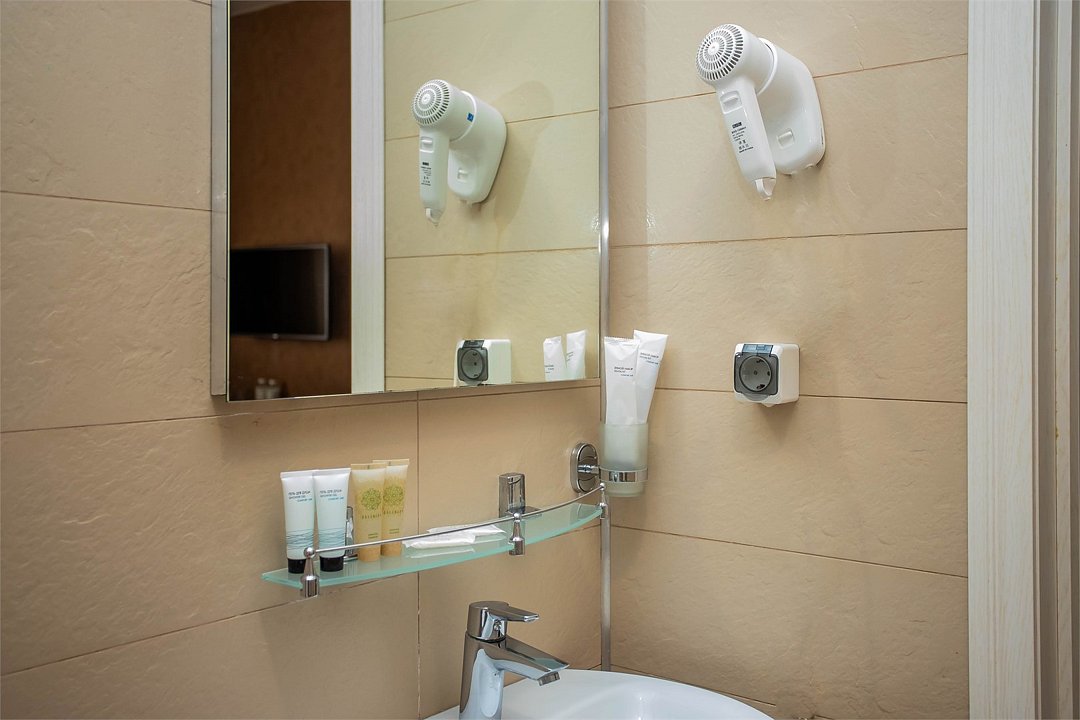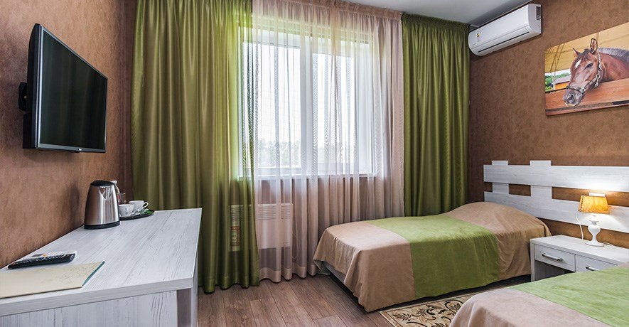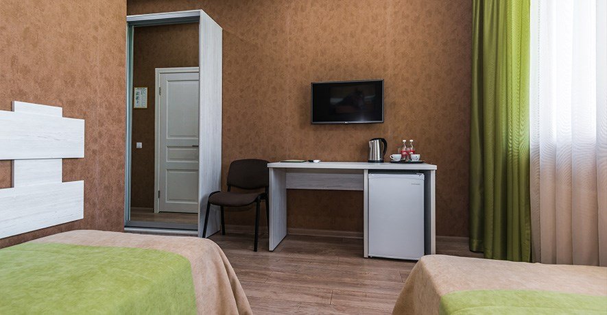 телевизор, Wi-Fi, фен, ванная комната, душевая кабина, санузел, тапочки, косметические средства, две односпальные или большая двуспальная кровать, тумбы, стулья, шкаф для одежды, вешалки, зеркало, чайный набор, обслуживание номеров, чайник, раковина, отопление, кулер на этаже, стаканы, стул, туалетные средства, туалет, сплит-система, внутренний телефон, мини-холодильник, москитная сетка, общественный бассейн, онлайн-регистрация до заезда, уборка номера, набор для приготовления чая и кофе, бутилированная вода, мыло, без питомцевВ номере