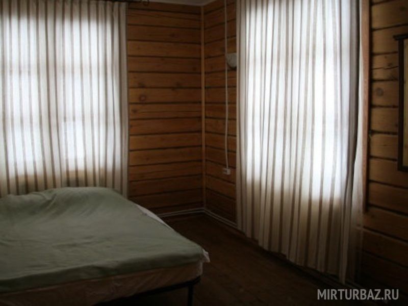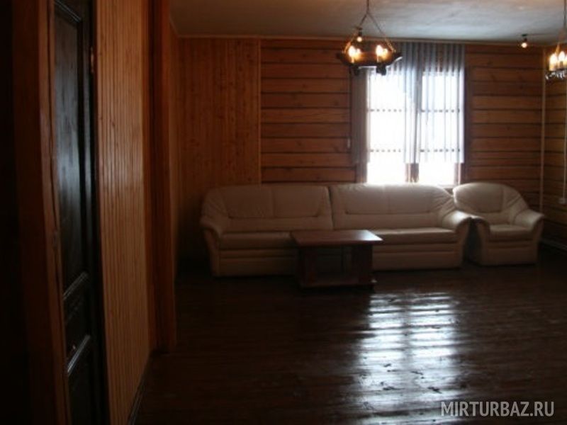 В коттедже гостиная с камином (2-а дивана, стол), 6-ть спальных комнат, кухня, душ, туалет.