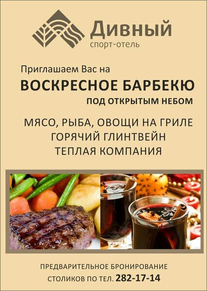 Друзья, спорт-отель "Дивный" приглашает Вас, каждое воскресенье, на зимнее барбекю под открытым небом на террасе. Вас ждет мясо, рыба на углях, горячий глинтвейн и теплая компания!!!