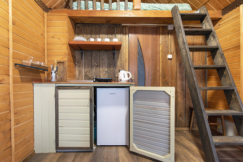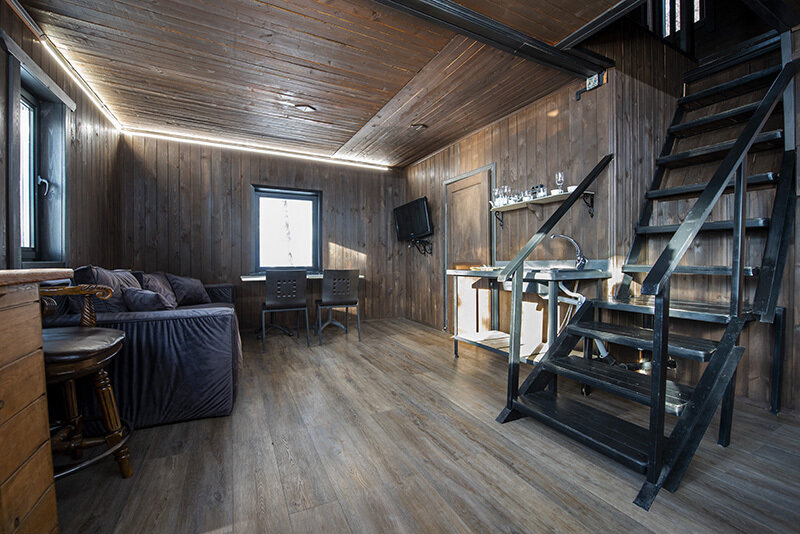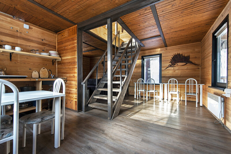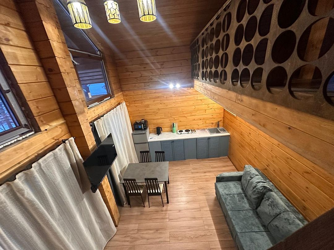 На первом этаже большой диван, изолированная спальня и общая кухня, санузел с душевой и раковиной.