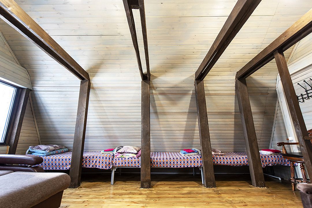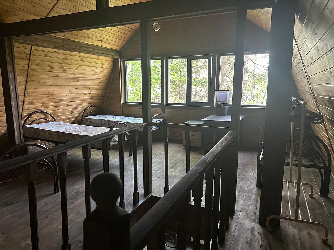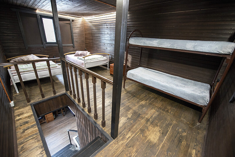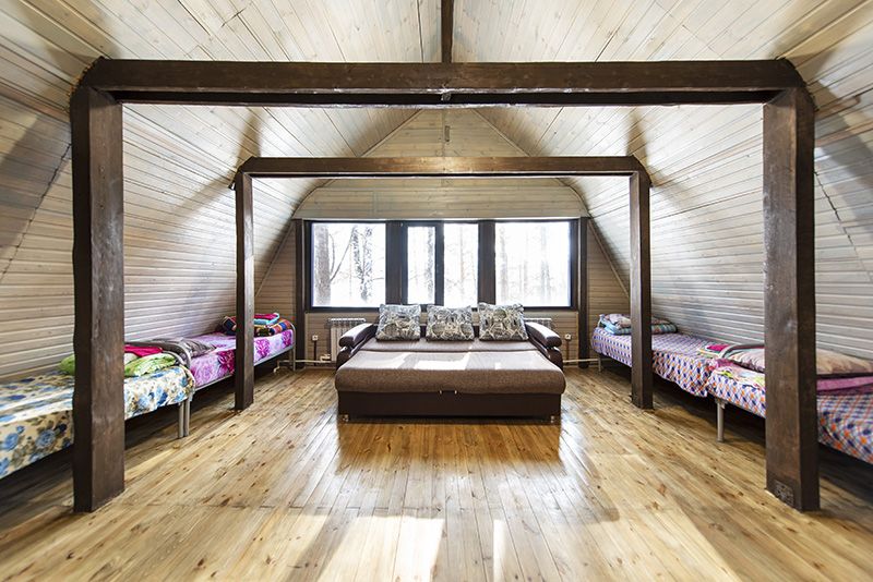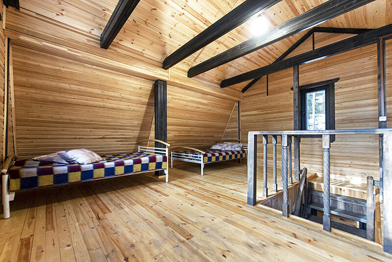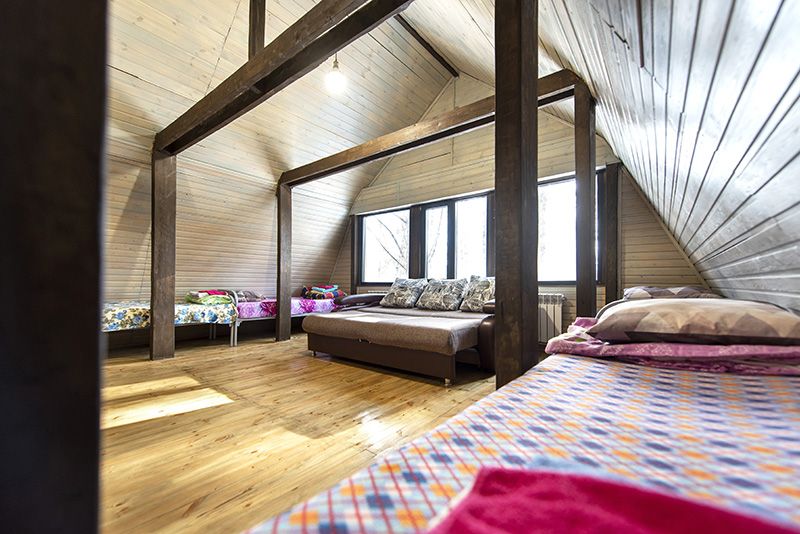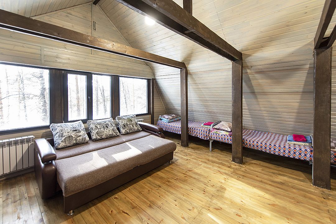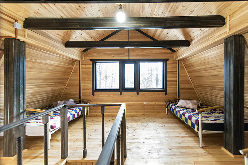 На втором этаже двухспальные и односпальные кровати на 8 мест.