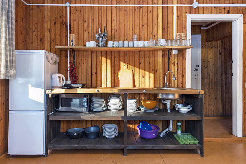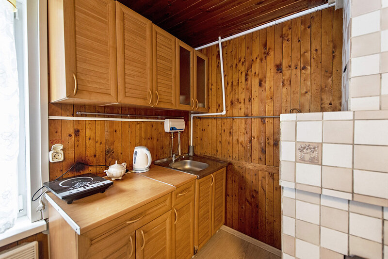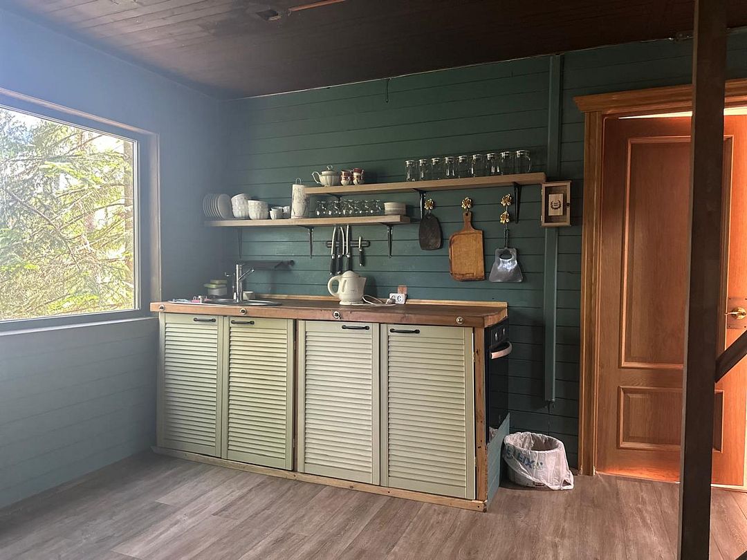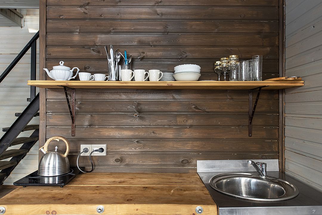На первом этаже общая кухня, один двухместных диван, санузел с душевой и раковиной.