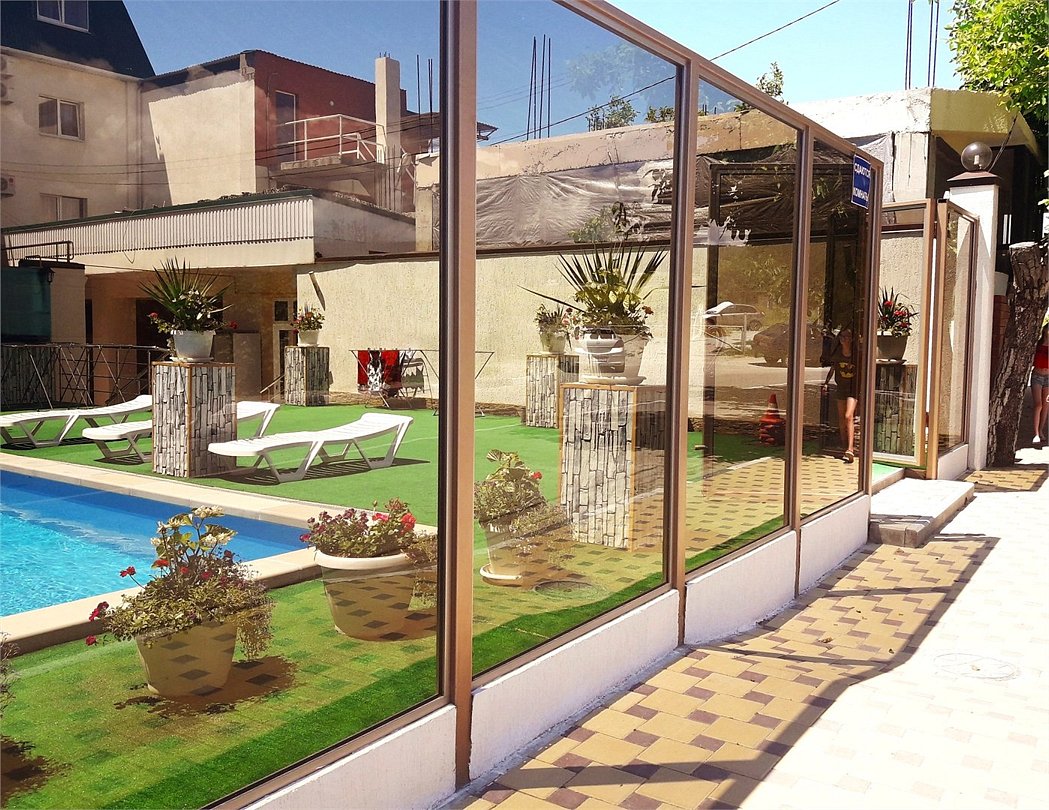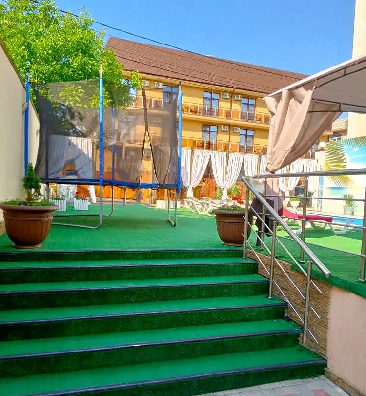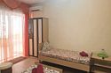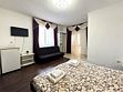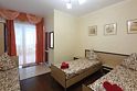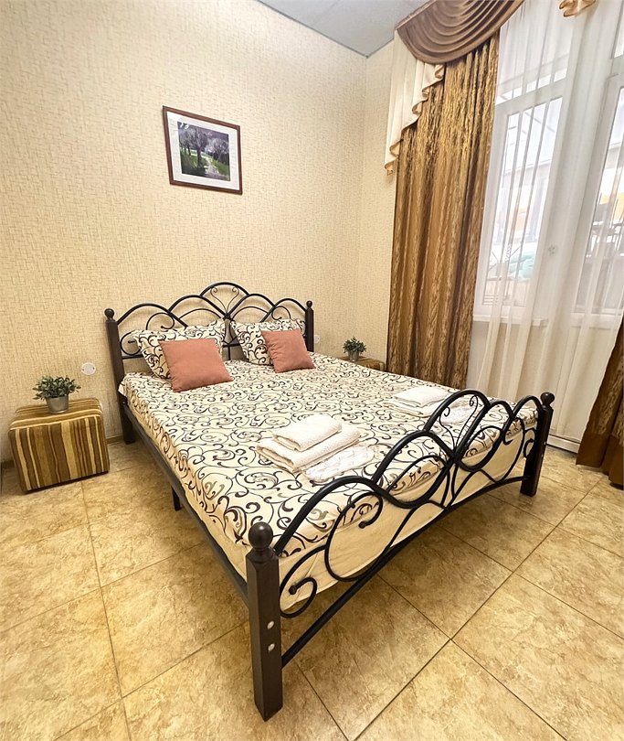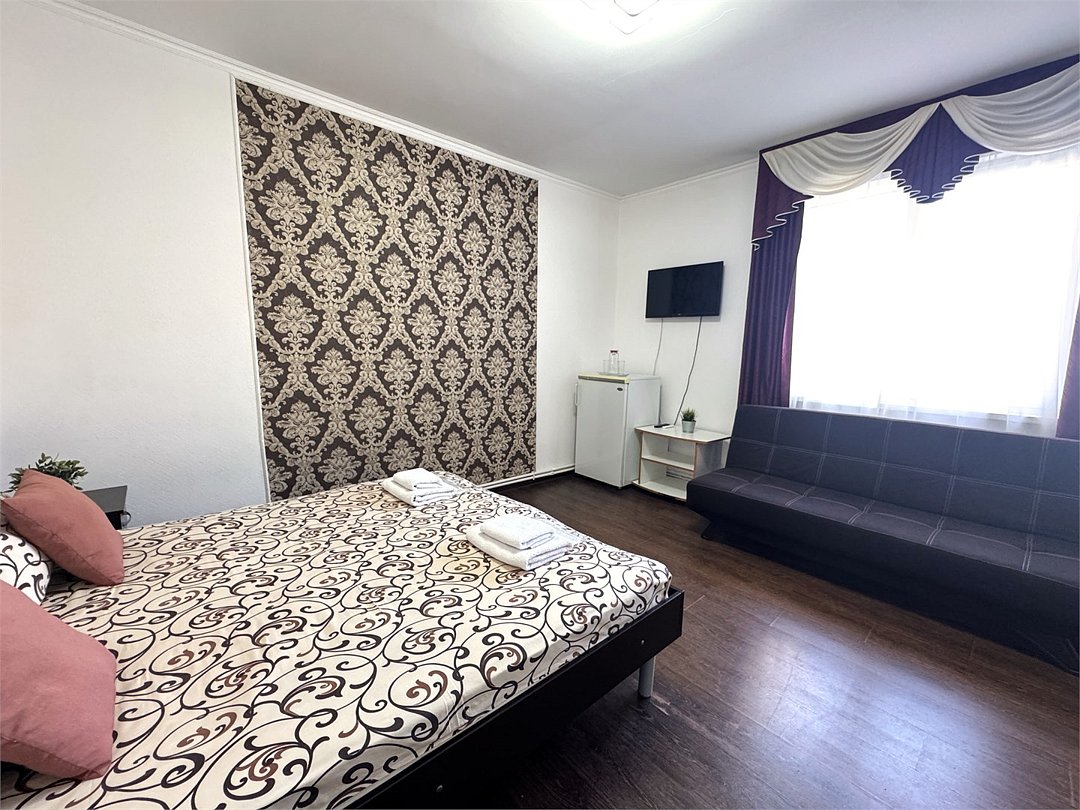 Семейный номер площадью 14 м 2 состоит из комнаты и санузла. Номера данной категории расположены на 2 этаже. В номерах категории стандарт окна выходят в холл отеля. В холле: столы, стулья для отдыхающих, чайник, гладильная доска, утюг. Номер оснащен двуспальной кроватью, раскладным диваном (ширина 1,2 м), шкафом для одежды, мини-холодильником, кондиционером, телевизором. Номер укомплектован постельным бельем, полотенцами. В ванной комнате установлен душ (без поддона). На верхние этажи подняться можно только по лестнице.Услуги и удобства