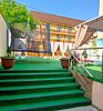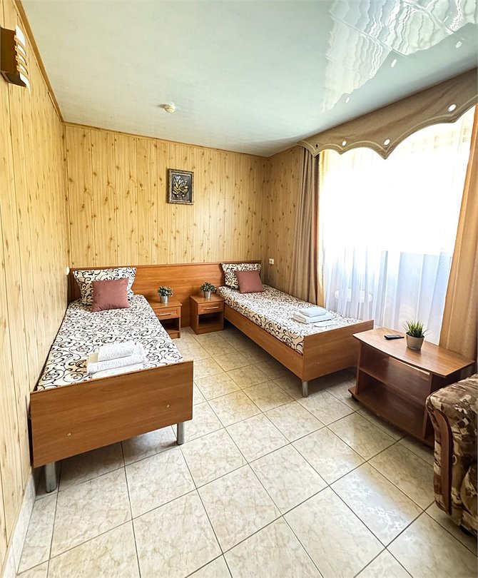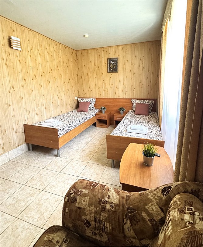 Семейный номер площадью 14 м 2 состоит из комнаты и санузла. Номера данной категории расположены на 1 этаже. В номерах категории стандарт окна выходят в холл отеля. В холле: столы, стулья для отдыхающих, чайник, гладильная доска, утюг. Номер оснащен двумя односпальными кроватями, диваном (ширина 1,2 м), шкафом для одежды, мини-холодильником, кондиционером, телевизором. Номер укомплектован постельным бельем, полотенцами. В ванной комнате установлен душ.Услуги и удобства