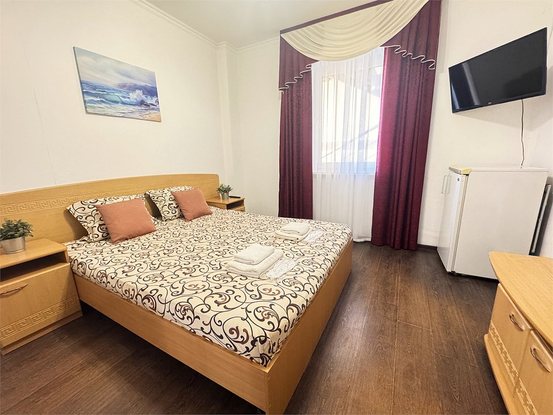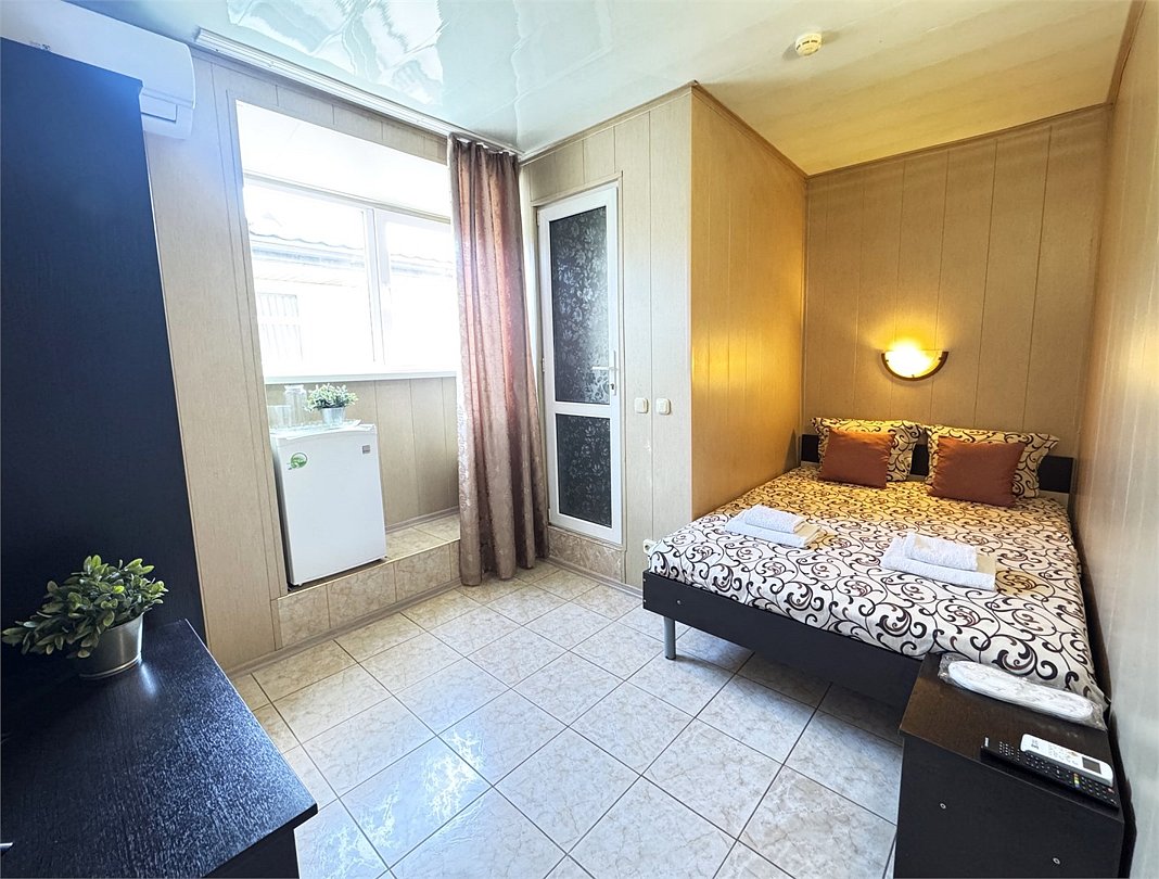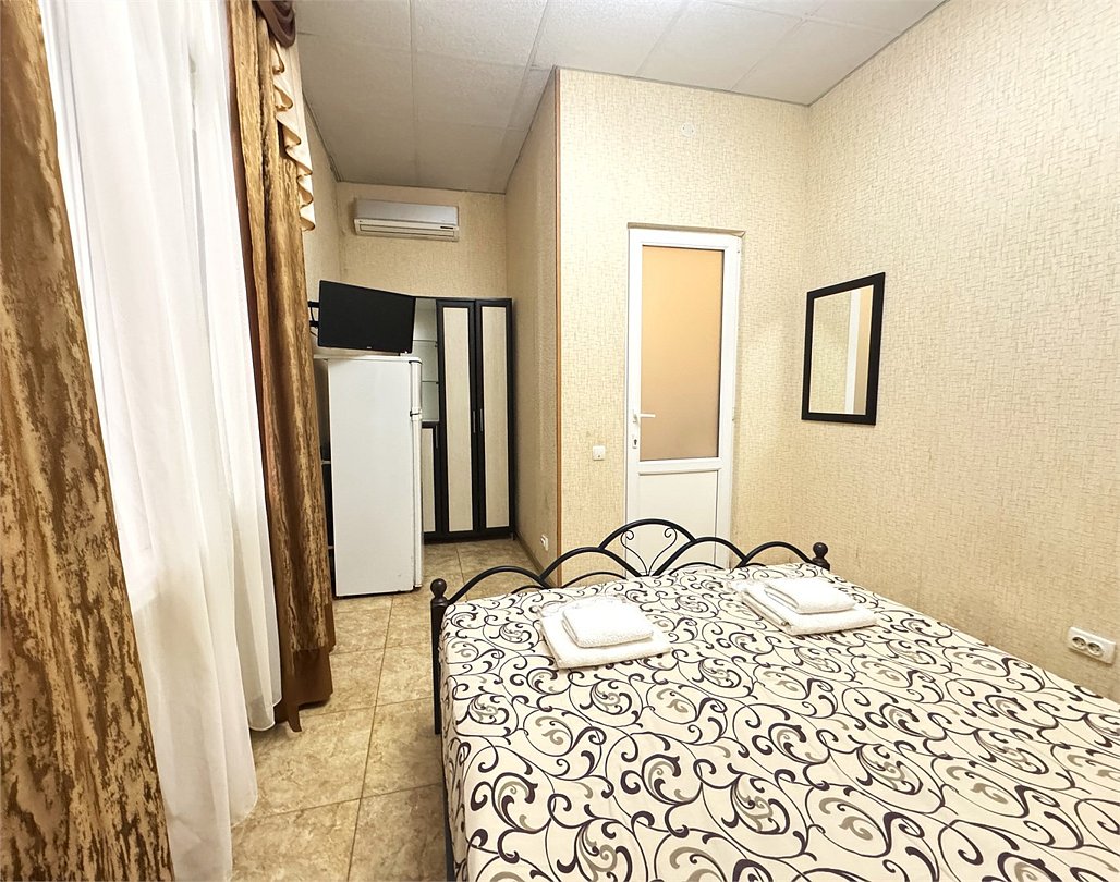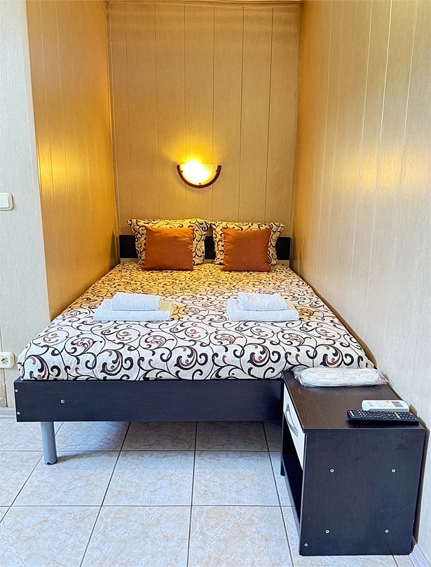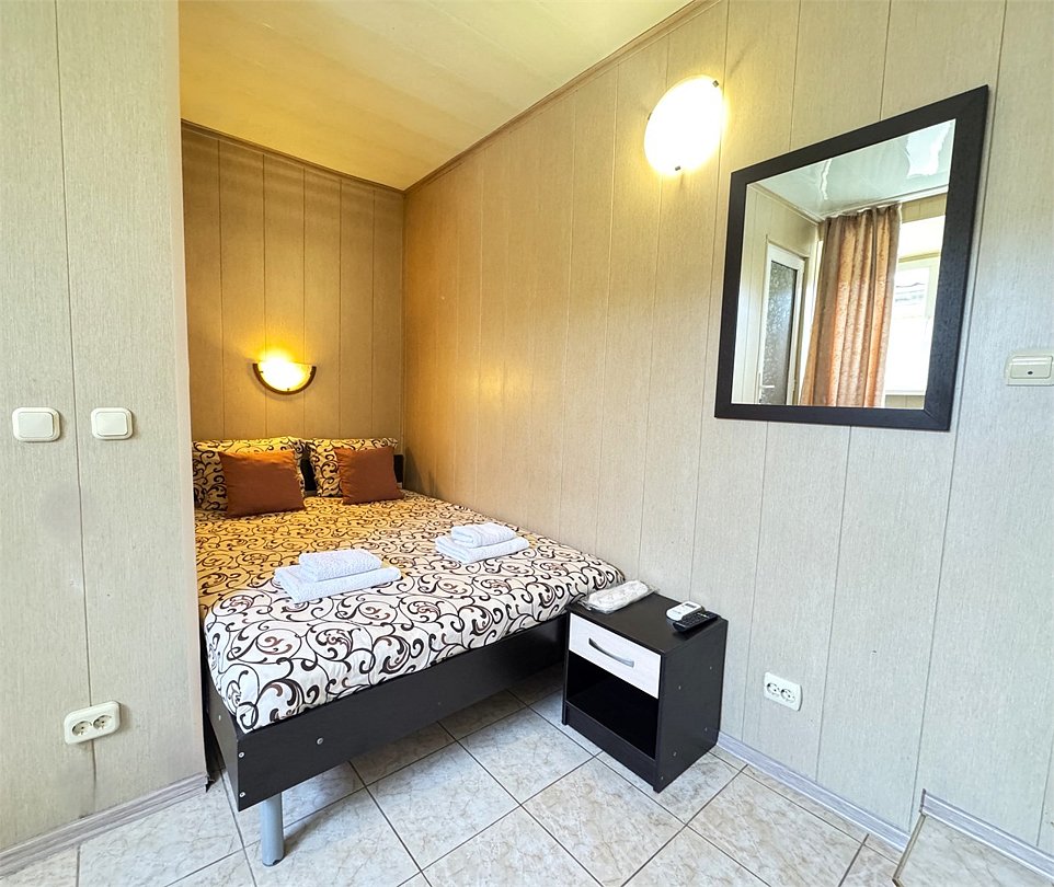 Уютный маленький двухместный номер площадью 10 м 2 состоит из комнаты и санузла. Номера данной категории расположены на 1 этаже, окна выходят в холл отеля. В холле: столы, стулья для отдыхающих, чайник, гладильная доска, утюг. Номер оснащен двуспальной кроватью, шкафом для одежды, мини-холодильником, кондиционером, телевизором. Номер укомплектован постельным бельем, полотенцами. В ванной комнате, укомплектованной набором туалетно-косметических принадлежностей, установлен душ (без поддона).Услуги и удобства