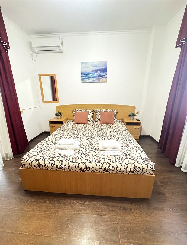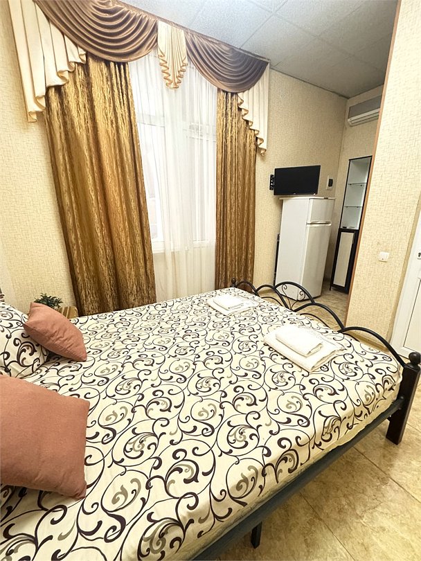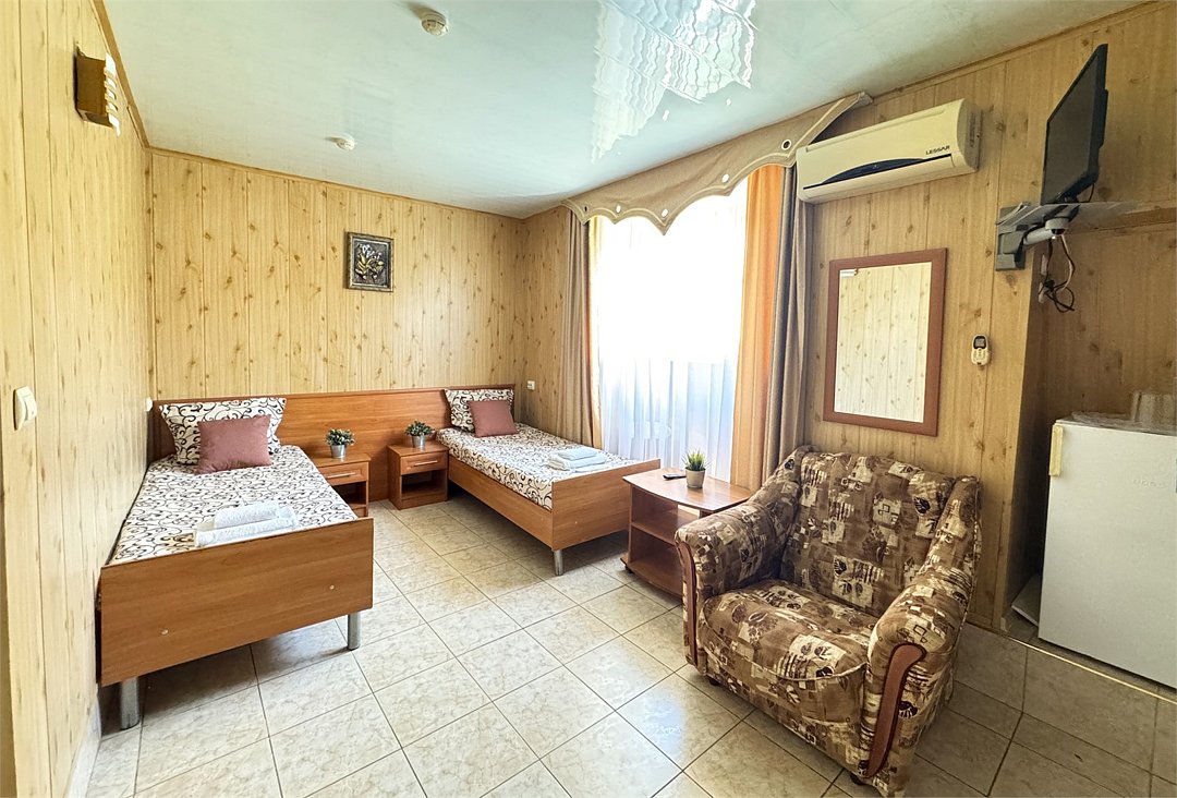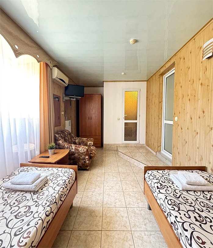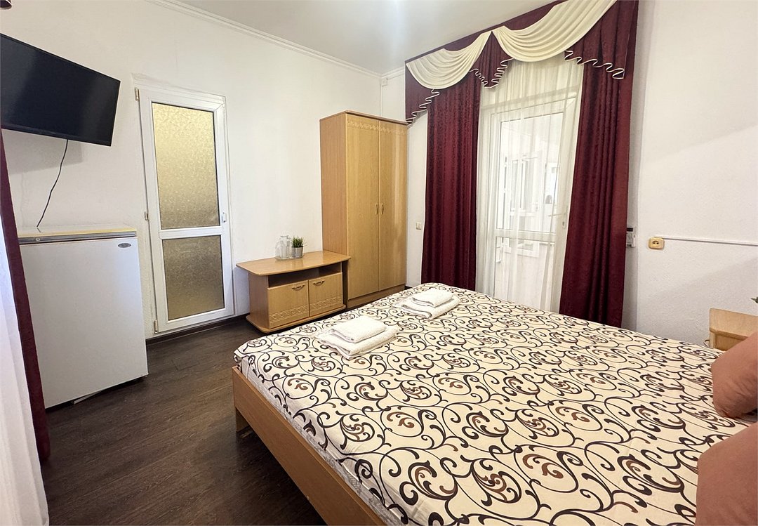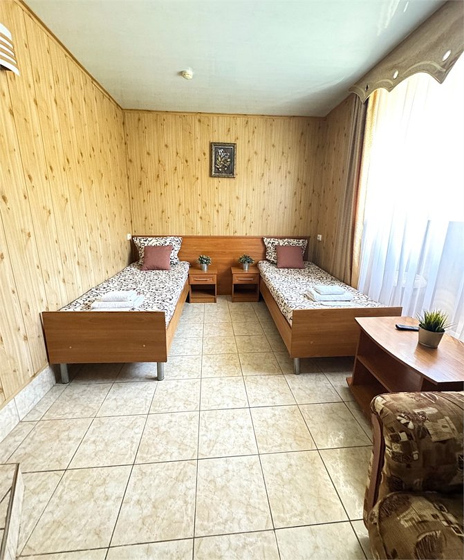 Уютный маленький двухместный номер площадью 10 м 2 состоит из комнаты и санузла. Номера данной категории расположены на 1 этаже, окна выходят в холл отеля. В холле: столы, стулья для отдыхающих, чайник, гладильная доска, утюг. Номер оснащен двуспальной кроватью, шкафом для одежды, мини-холодильником, кондиционером, телевизором. Номер укомплектован постельным бельем, полотенцами. В ванной комнате, укомплектованной набором туалетно-косметических принадлежностей, установлен душ (без поддона).Услуги и удобства