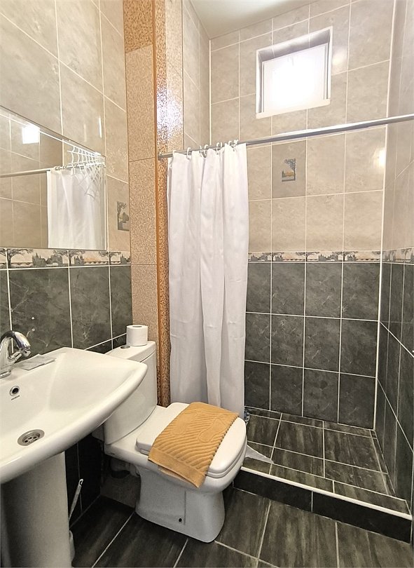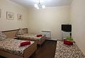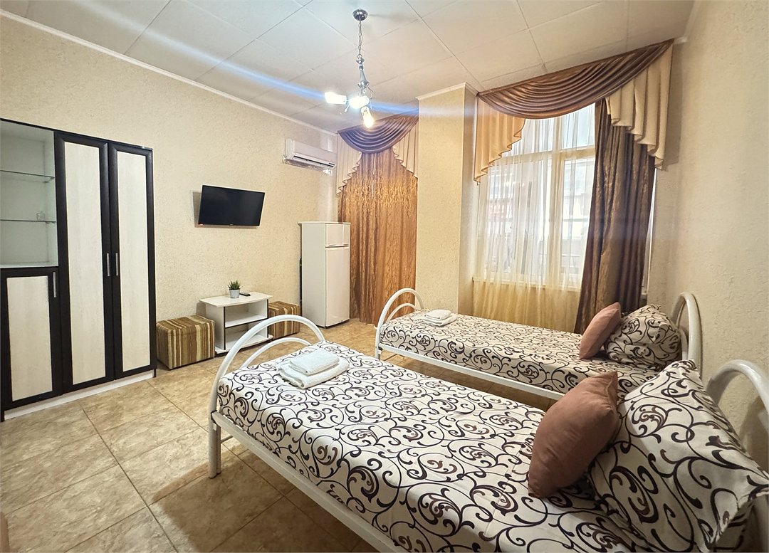 Семейный номер площадью 14 м 2 состоит из комнаты и санузла. Номера данной категории расположены на 3 этаже. На верхние этажи подняться можно только по лестнице. В номерах категории стандарт окна выходят в холл отеля. В холле: столы, стулья для отдыхающих, чайник, гладильная доска, утюг. Номер оснащен тремя односпальными кроватями, шкафом для одежды, мини-холодильником, кондиционером, телевизором. Номер укомплектован постельным бельем, полотенцами. В ванной комнате, укомплектованной набором туалетно-косметических принадлежностей, установлен душ (без поддона).Услуги и удобства