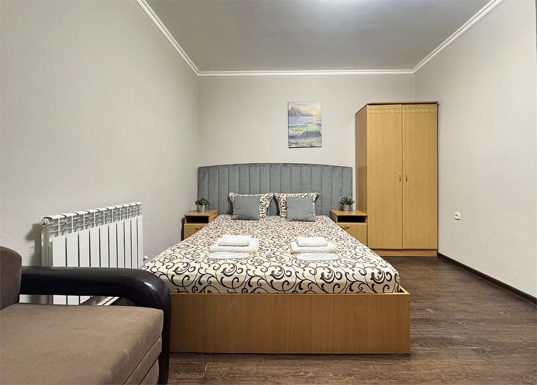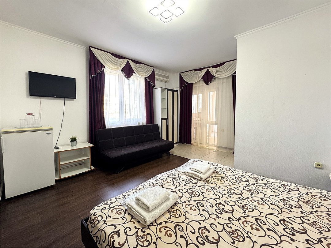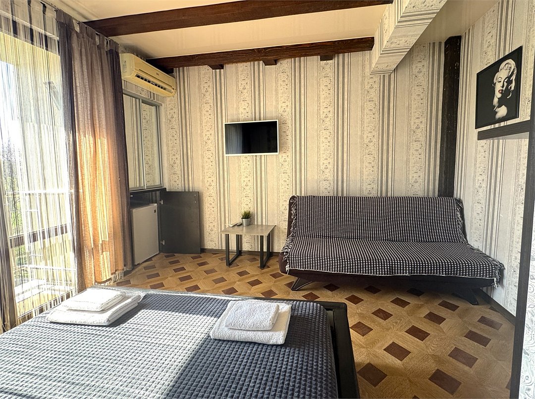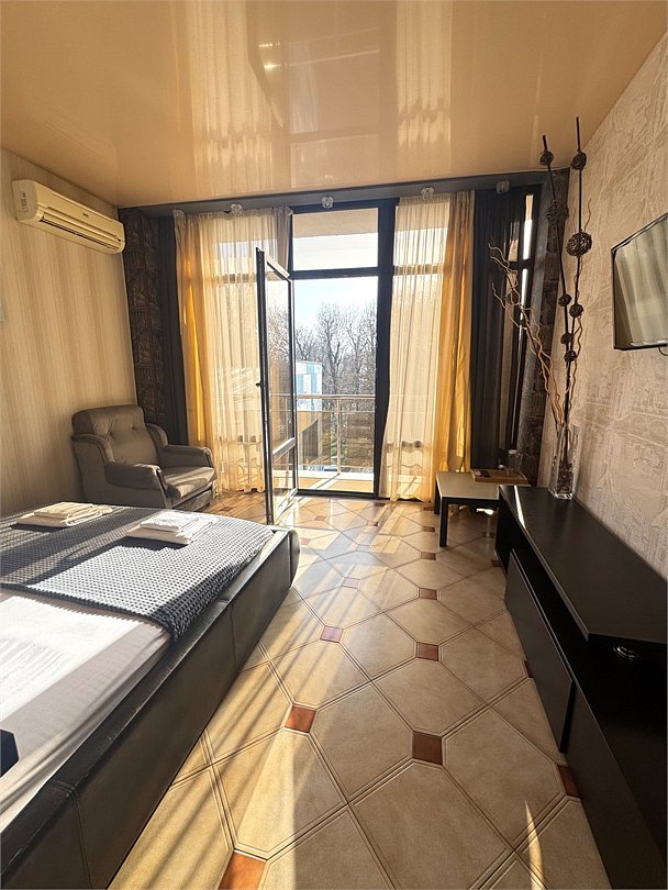 Wi-Fi, кондиционер, банные полотенца, тапочки, балкон, двуспальная кровать, зеркало, обслуживание номеров, унитаз, раковина, душ, плиточное покрытие, стаканы, туалетные средства, диван-кровать, раскладной диван, телевизор с плоским экраном, мини-холодильник, шкаф-купе, номер для некурящих, пуфик, общественный бассейн, мыло, можно с питомцамиВ номере