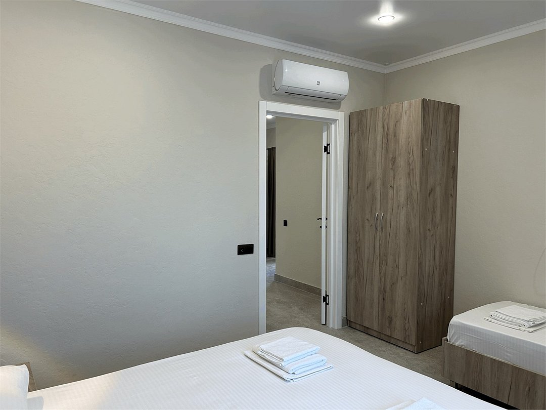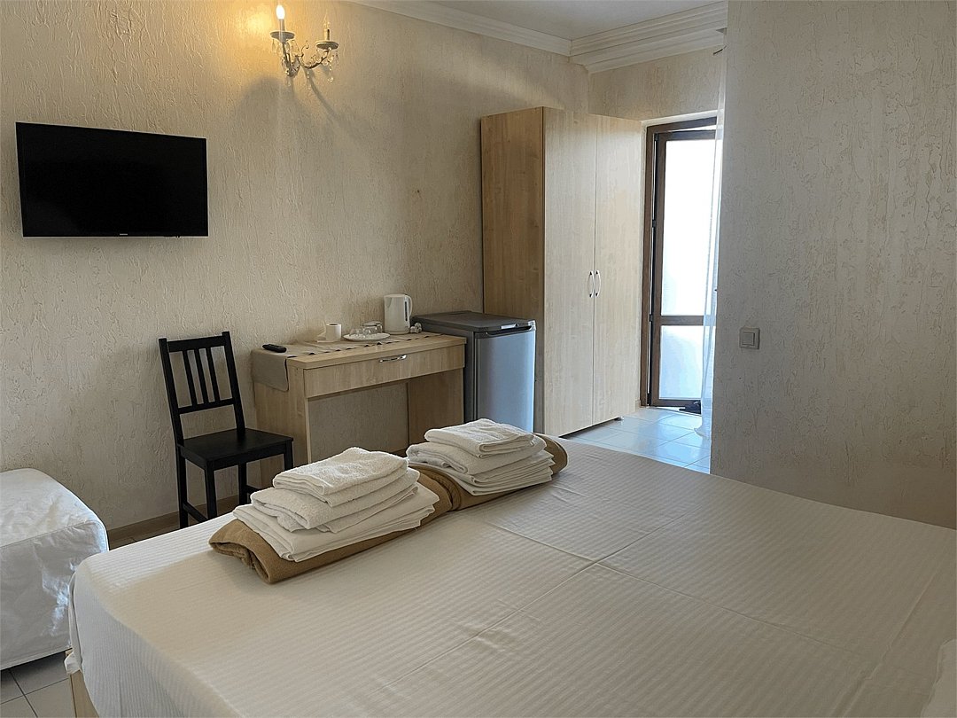 кондиционер, фен, банные полотенца, двуспальная кровать, две односпальные кровати, шкаф для одежды, зеркало, чайник, раковина, душ, стаканы, стул, тумба, туалет, сплит-система, сушилка для белья, телевизор с плоским экраном, мини-холодильник, номер для некурящих, рабочий стол, общественный бассейн, услуги прачечной (платно)В номере