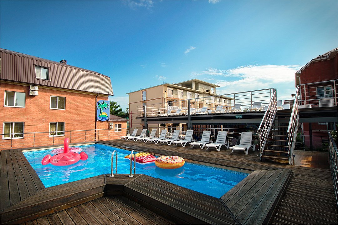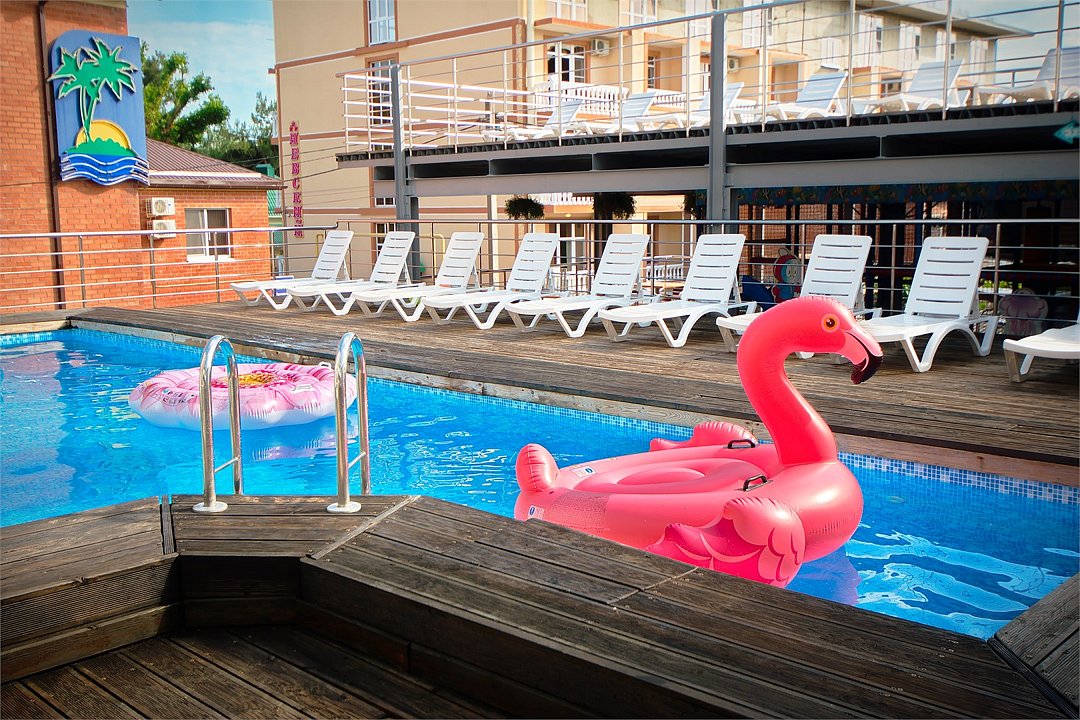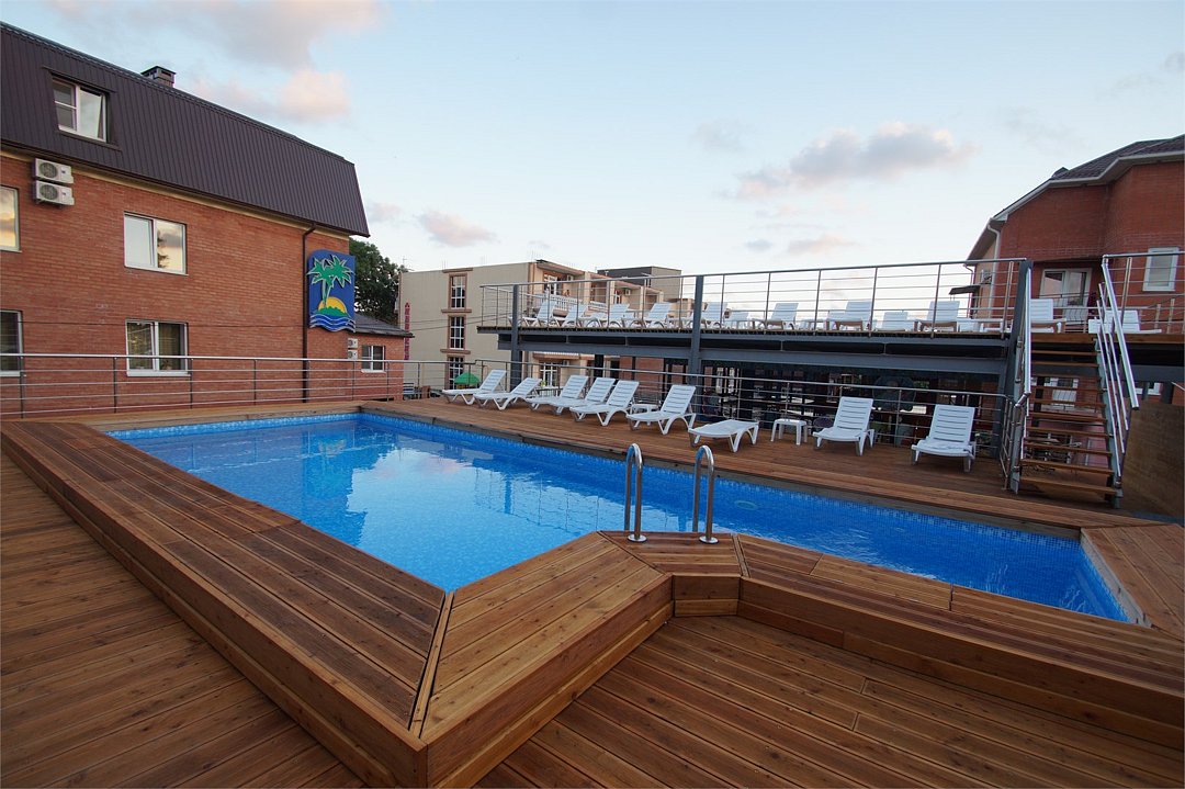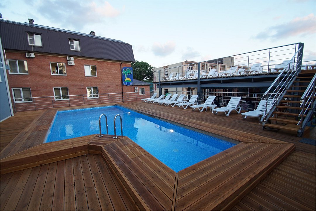 - Подогреваемый бассейн с комфортными лежаками;