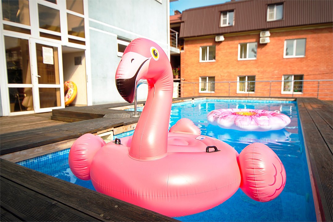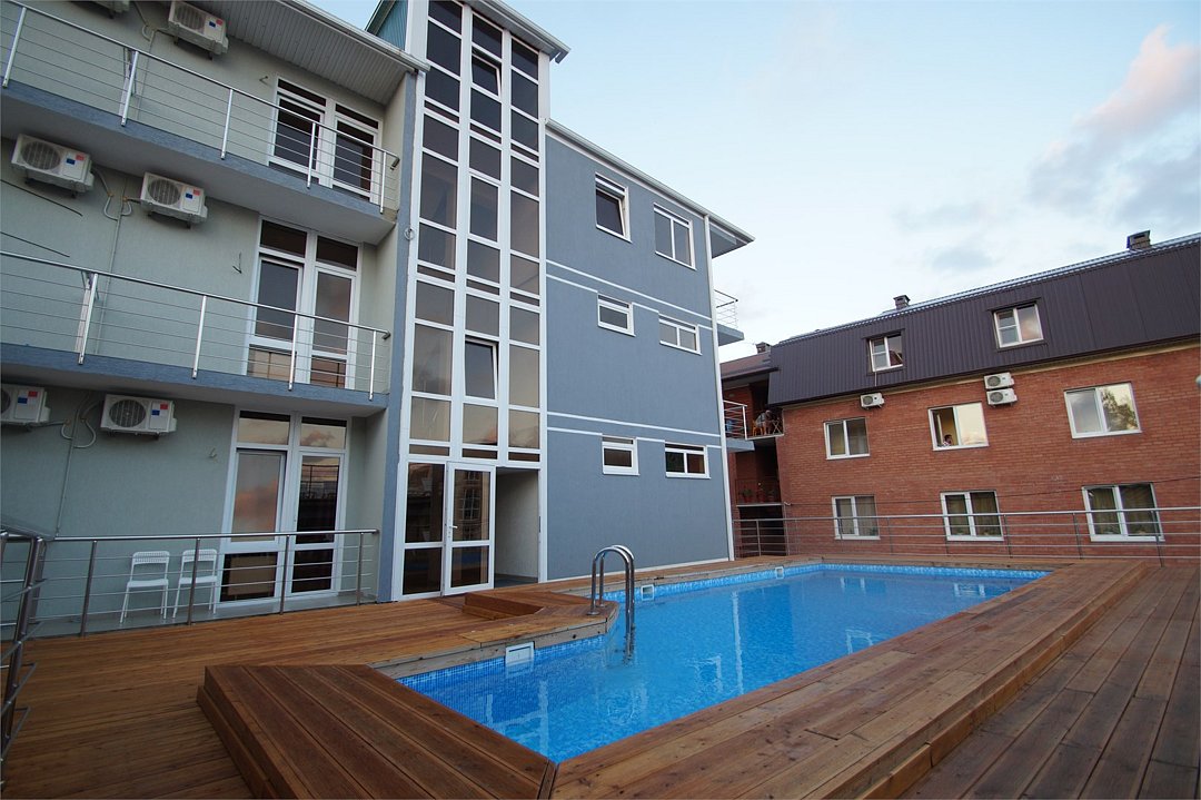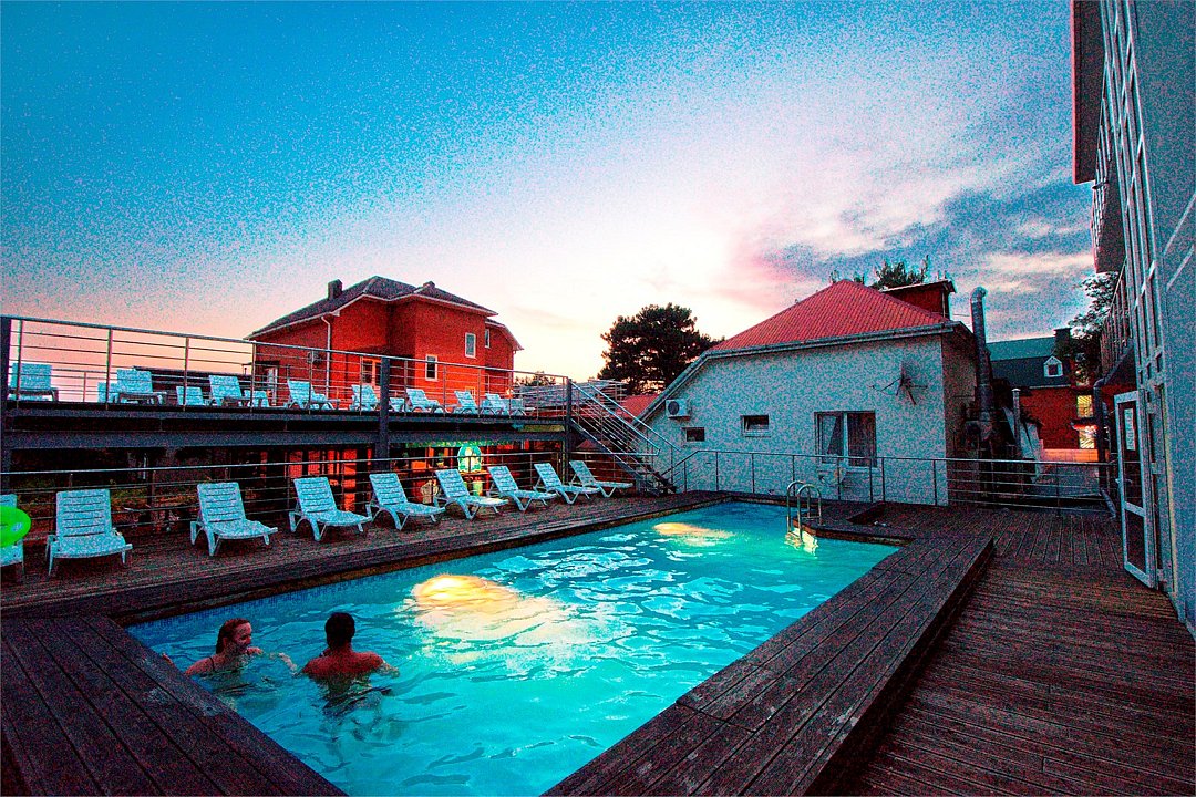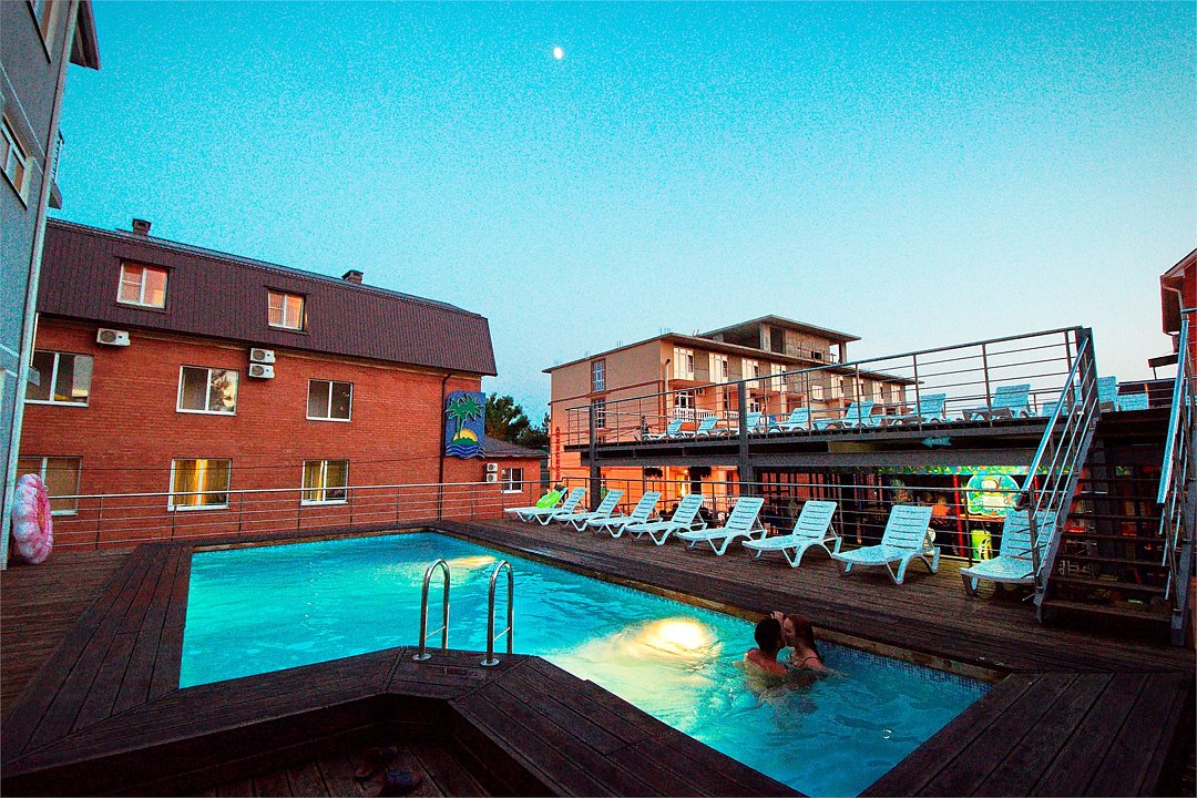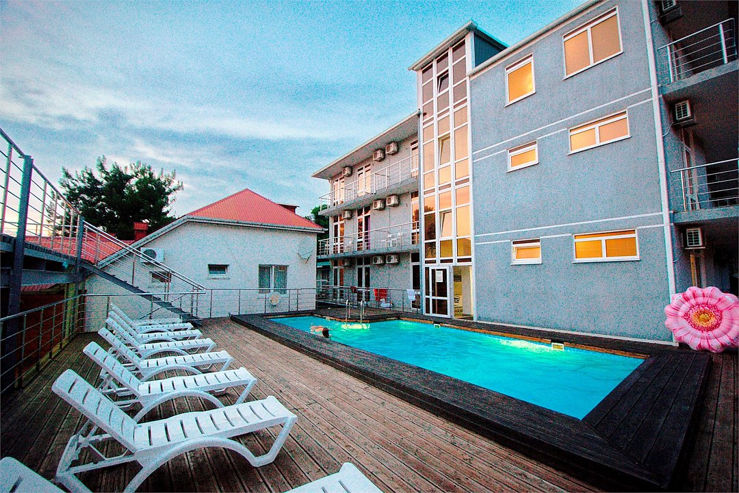 - Подогреваемый бассейн с комфортными лежаками;