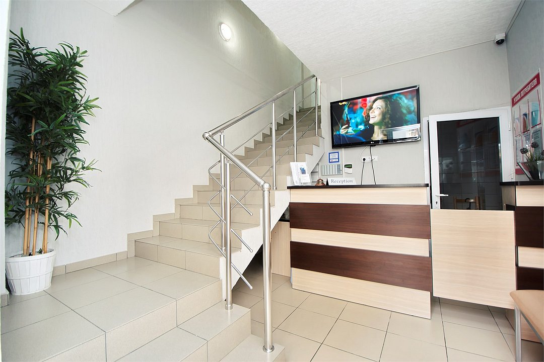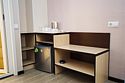 4. Ресепшн небольшой - стойка, 2 дивана для поетителей, кулер, микроволновка (где можно разогреть еду), столик с журналами и телевизор.