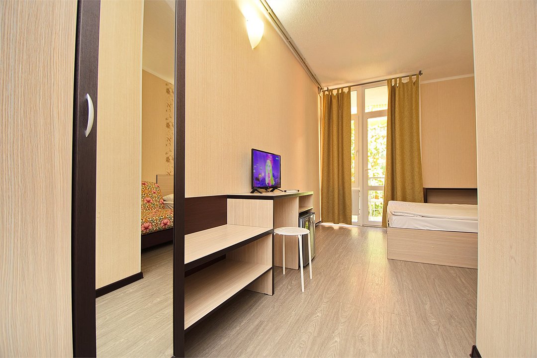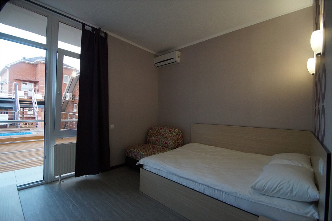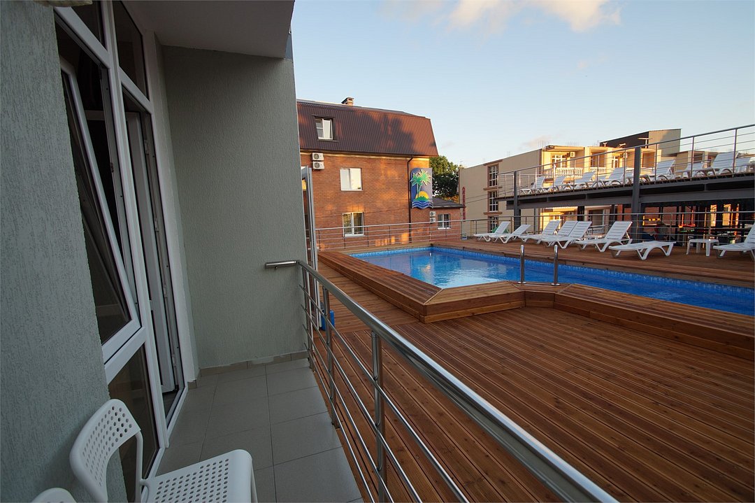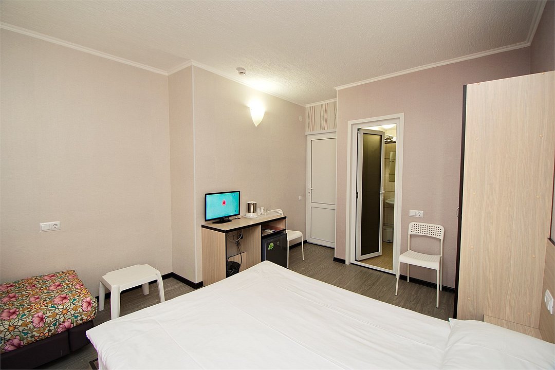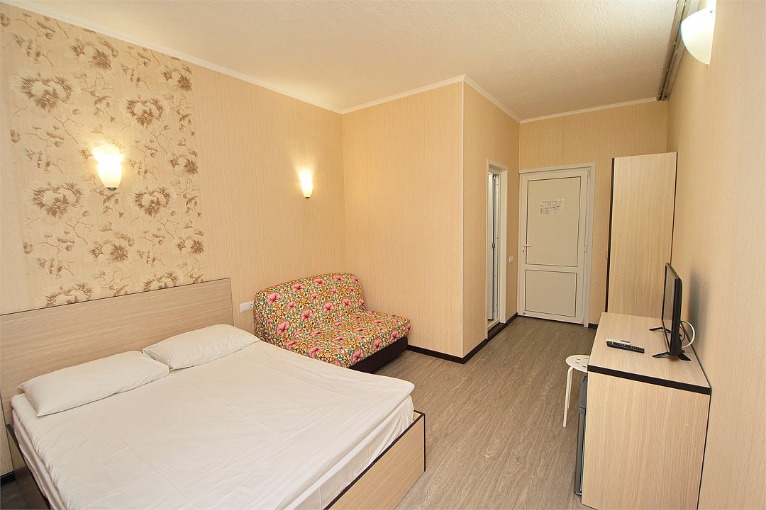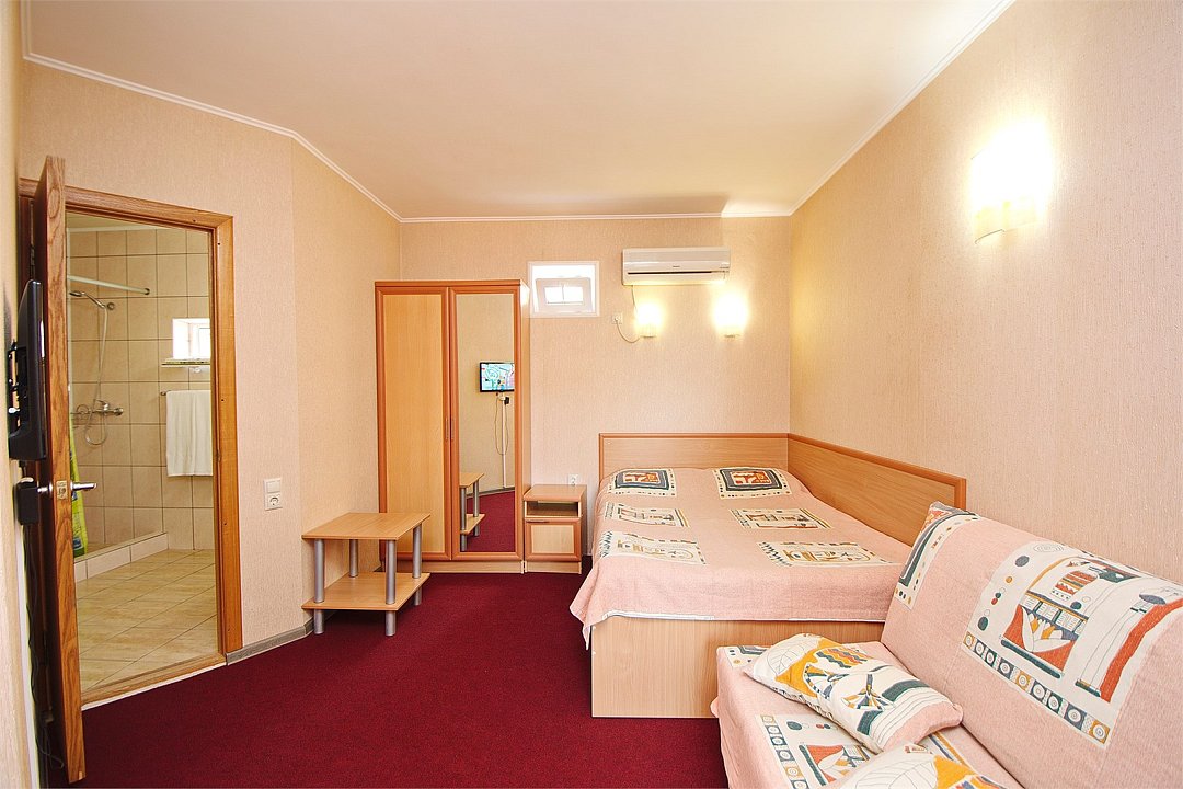 Уютный 3х-местный номер с видом на бассейн. В номере 2-х спальная кровать (1,6м*2м) и кресло-кровать (0,8м*1.9м). Также есть балкон с мебелью. В номере есть все необходимое для комфортного проживания: с\у с душевой, раковиной и унитазом, сплит-система, мини-холодильник, WI-FI, ТВ на 20 каналов, прикроватная тумба, шкаф, стол, стул, чайник, фен, полотенца, мыльные принадлежности.Услуги и удобства