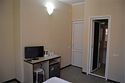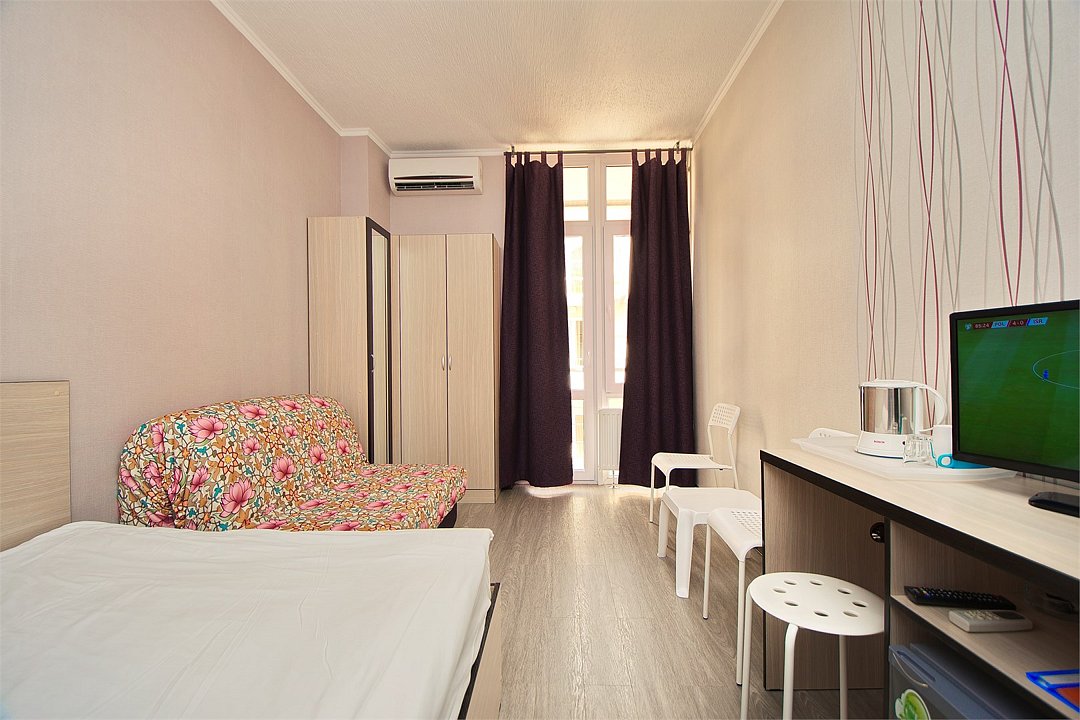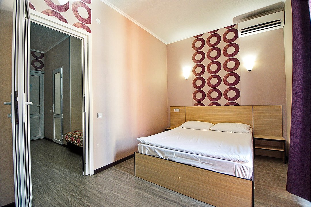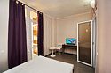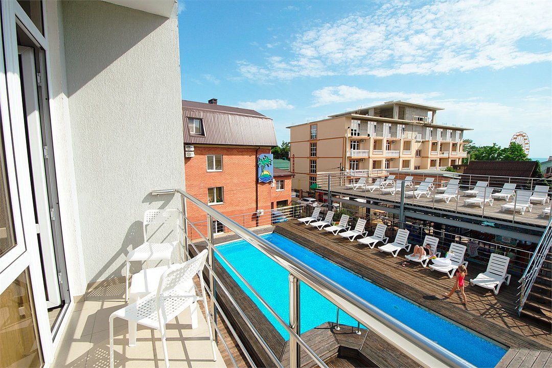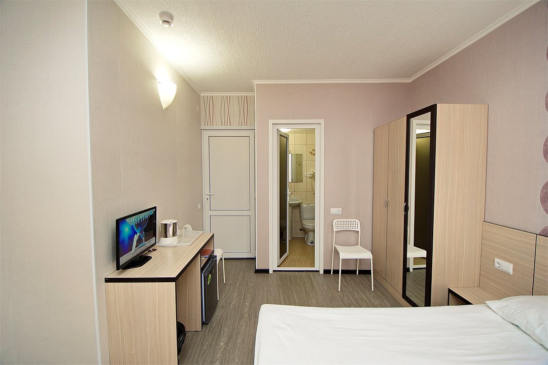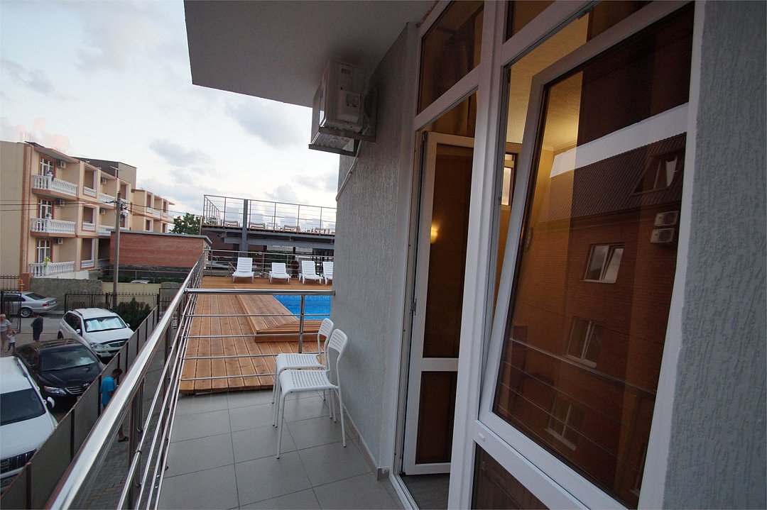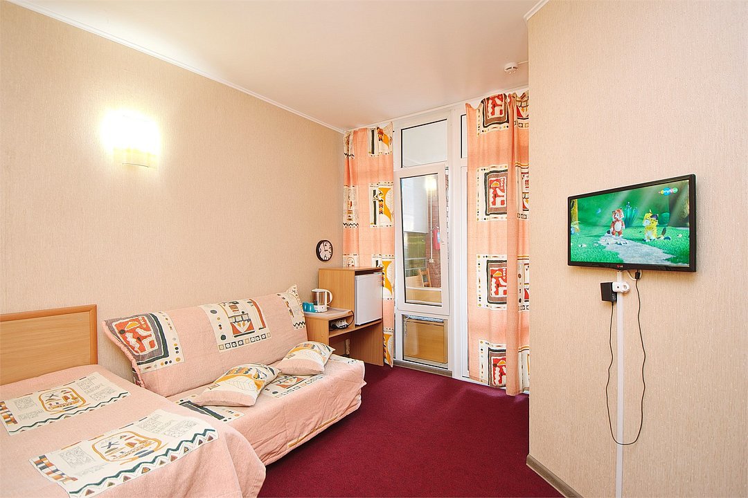 Уютный 3х-местный номер с видом на бассейн. В номере 2-х спальная кровать (1,6м*2м) и кресло-кровать (0,8м*1.9м). Также есть балкон с мебелью. В номере есть все необходимое для комфортного проживания: с\у с душевой, раковиной и унитазом, сплит-система, мини-холодильник, WI-FI, ТВ на 20 каналов, прикроватная тумба, шкаф, стол, стул, чайник, фен, полотенца, мыльные принадлежности.Услуги и удобства