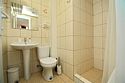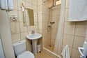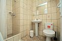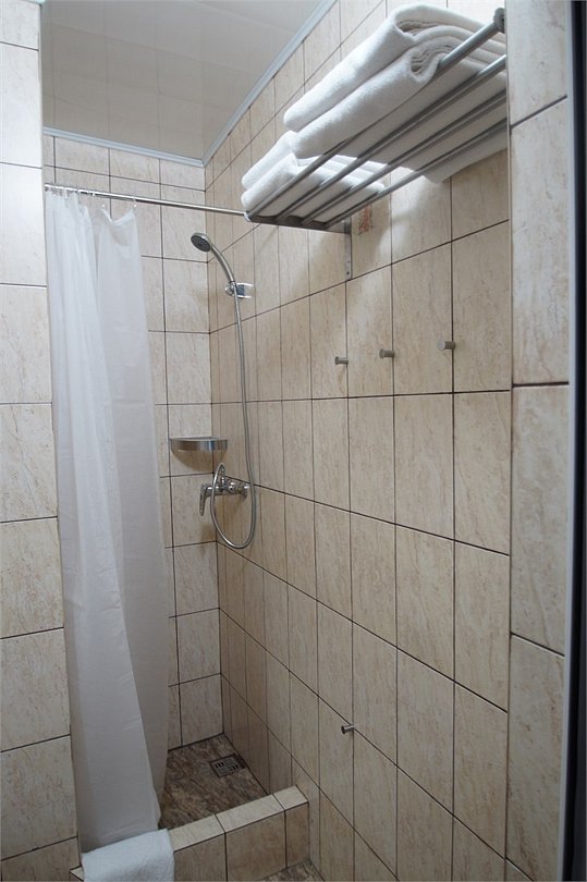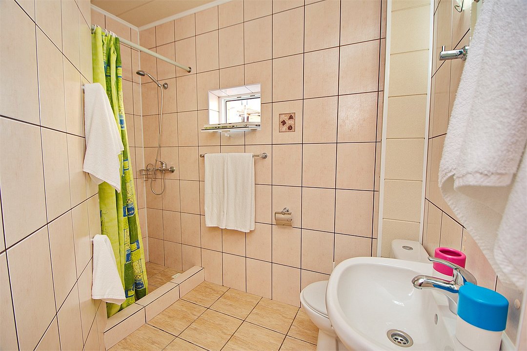 7. В комнате - у нас был номер на 3 человек плюс доп место - двухспальная и односпальная кровати, раскладывающееся кресло для 4-го, три тумбочки, холодильник, телевизор, стол с 2 стульями. Есть настольная лампа.Пол - плитка. Кондиционер... Висит так, что направлен на раскладывающееся кресло, потому на ночь включить его не получается, если вас 4 человека в номере. Шкаф и тумба в прихожке. Санузел обычный - унитаз, умывальник, душ. Кабинка душевая маленькая, конечно, но нам хватало. С водой никогда проблем не было.