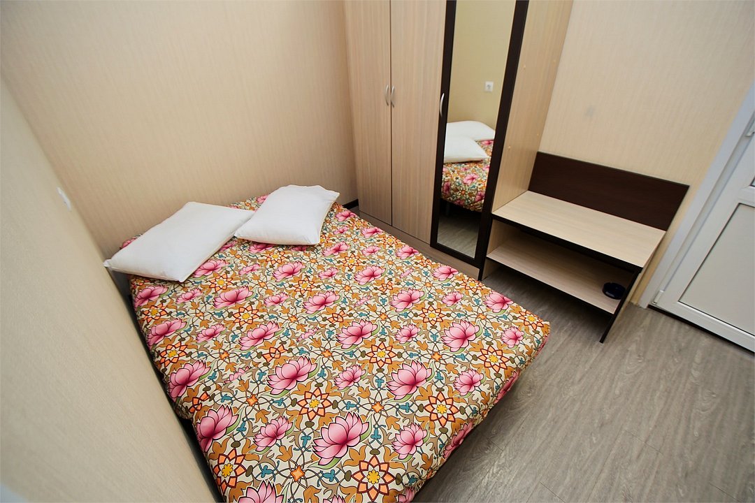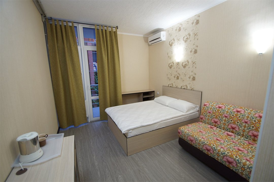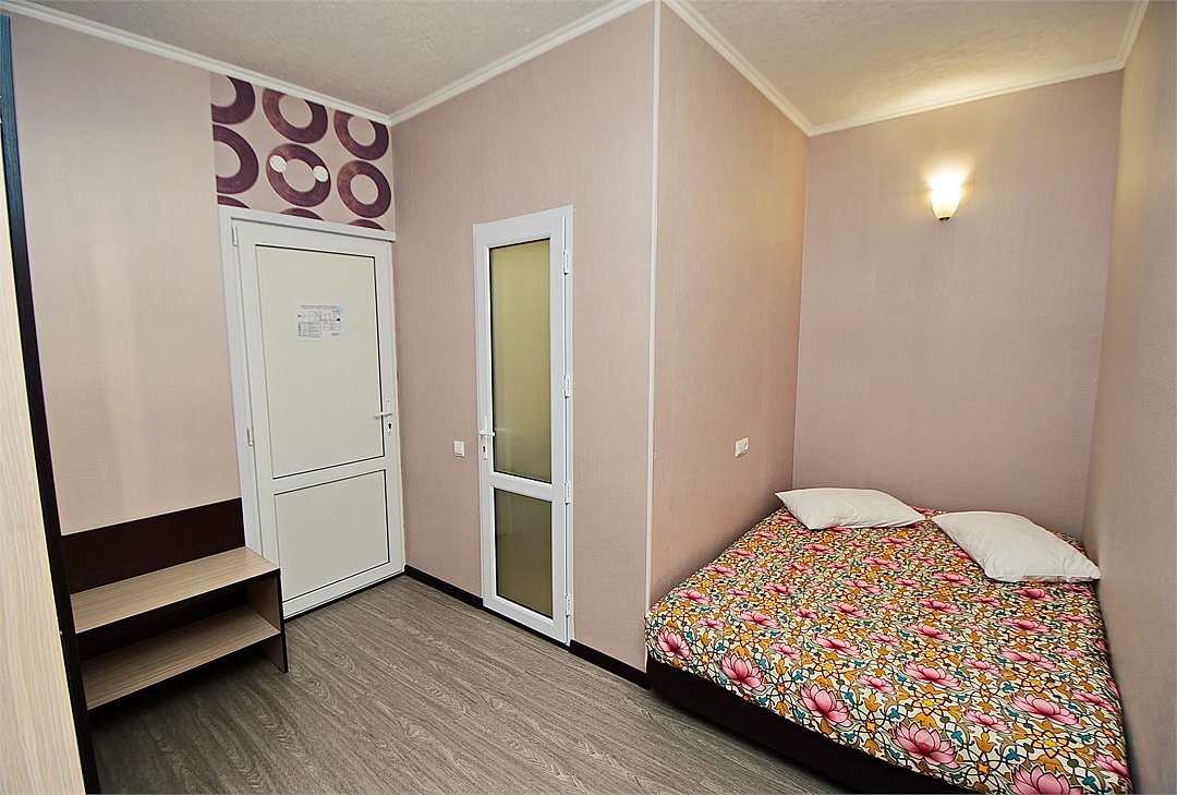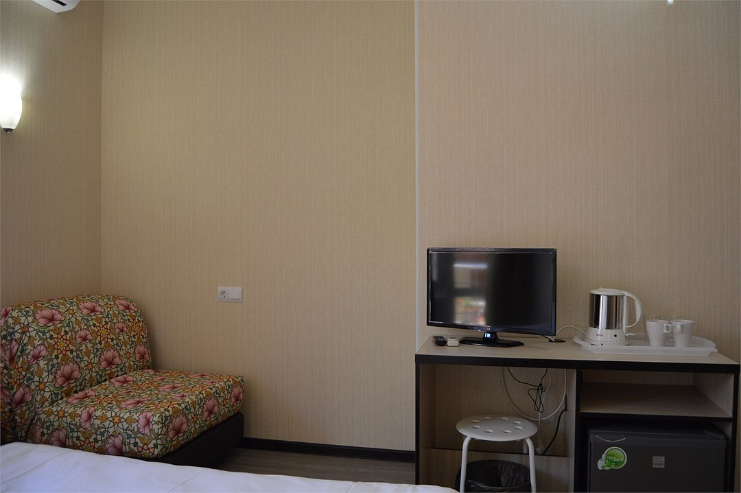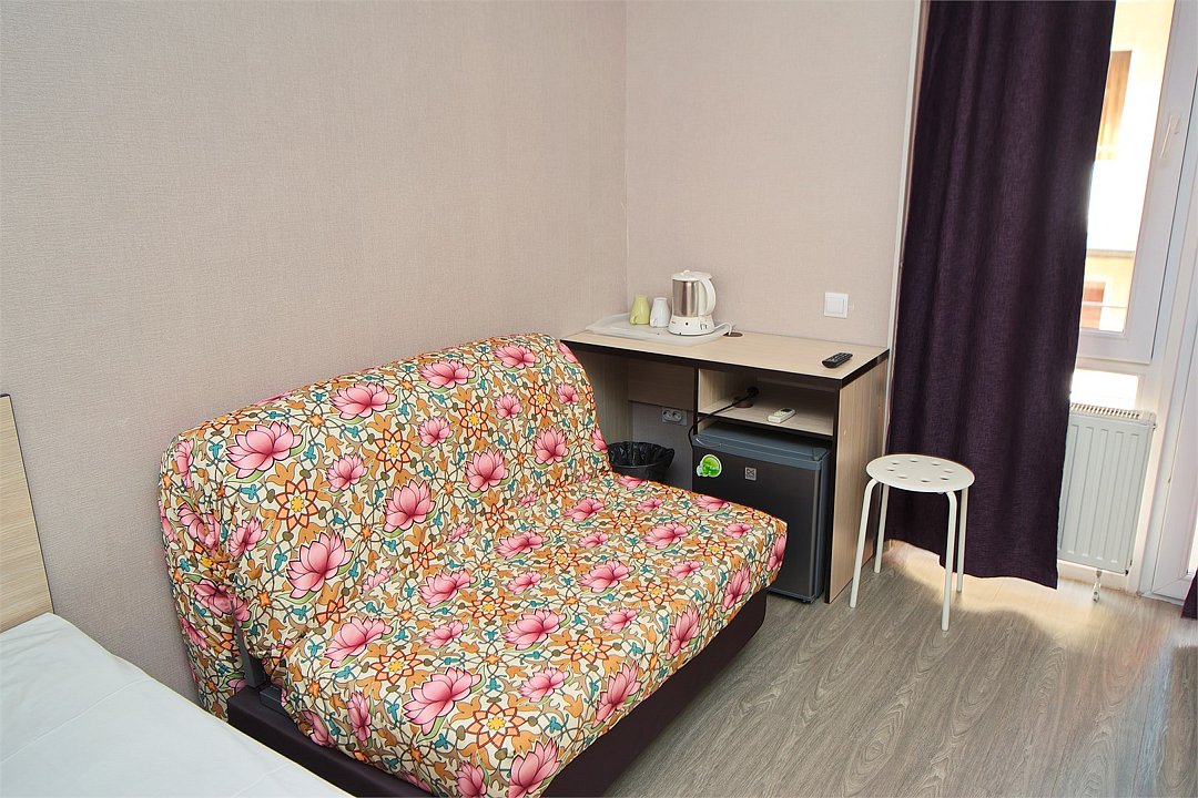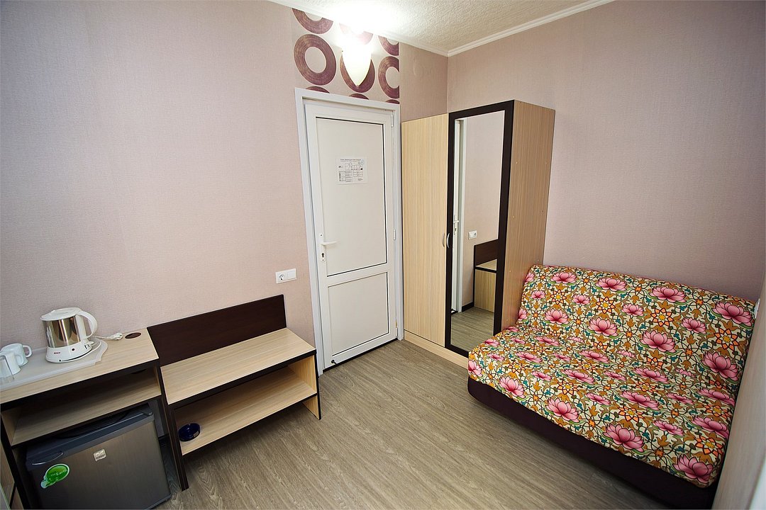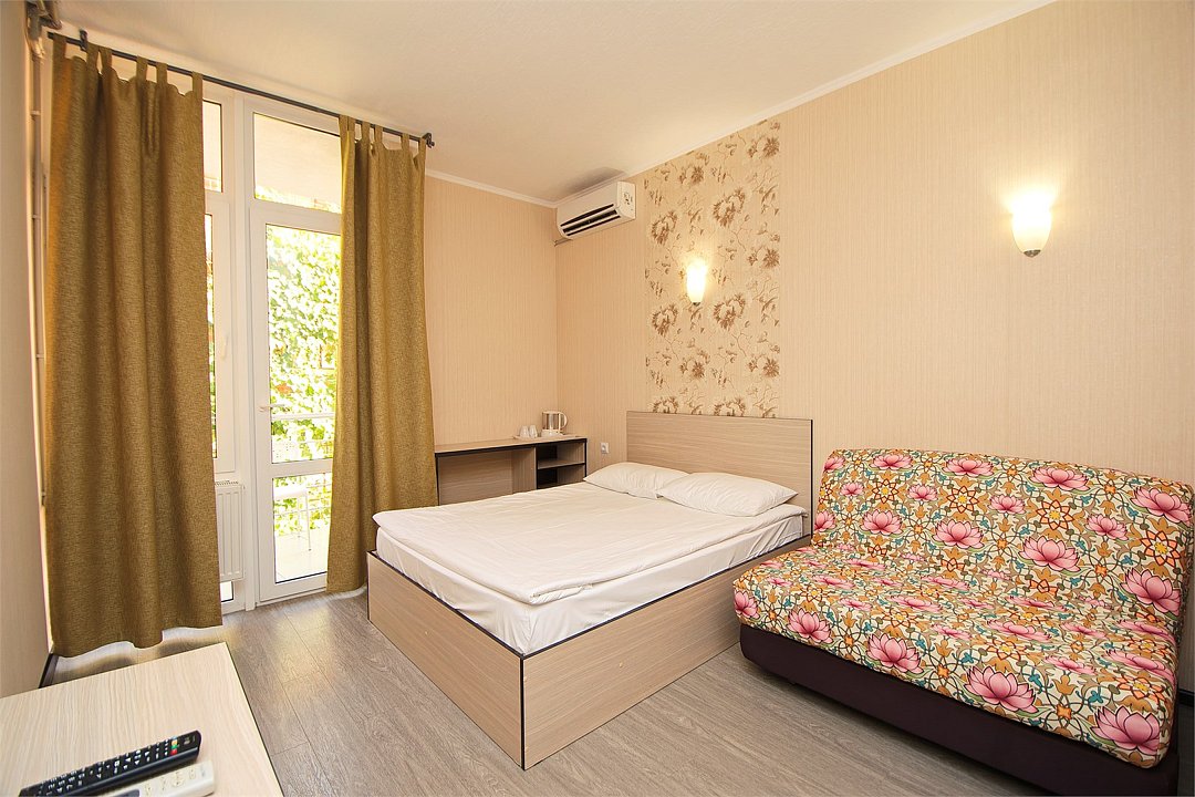Стандартный 2-х местный номер. В номере большая двуспальная кровать (1,6м*2м) и раскладной диван-кровать (1,4м*1.9м). Также есть общий балкон на этаже на 3 номера. В номере есть все необходимое для комфортного проживания: С\у с душевой, раковиной и унитазом, сплит-система, мини-холодильник, ТВ на 20 каналов, прикроватная тумба, прикроватный светильник, шкаф, журнальный столик, чайник, полотенца, мыльные принадлежности.Услуги и удобства
