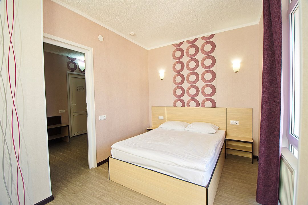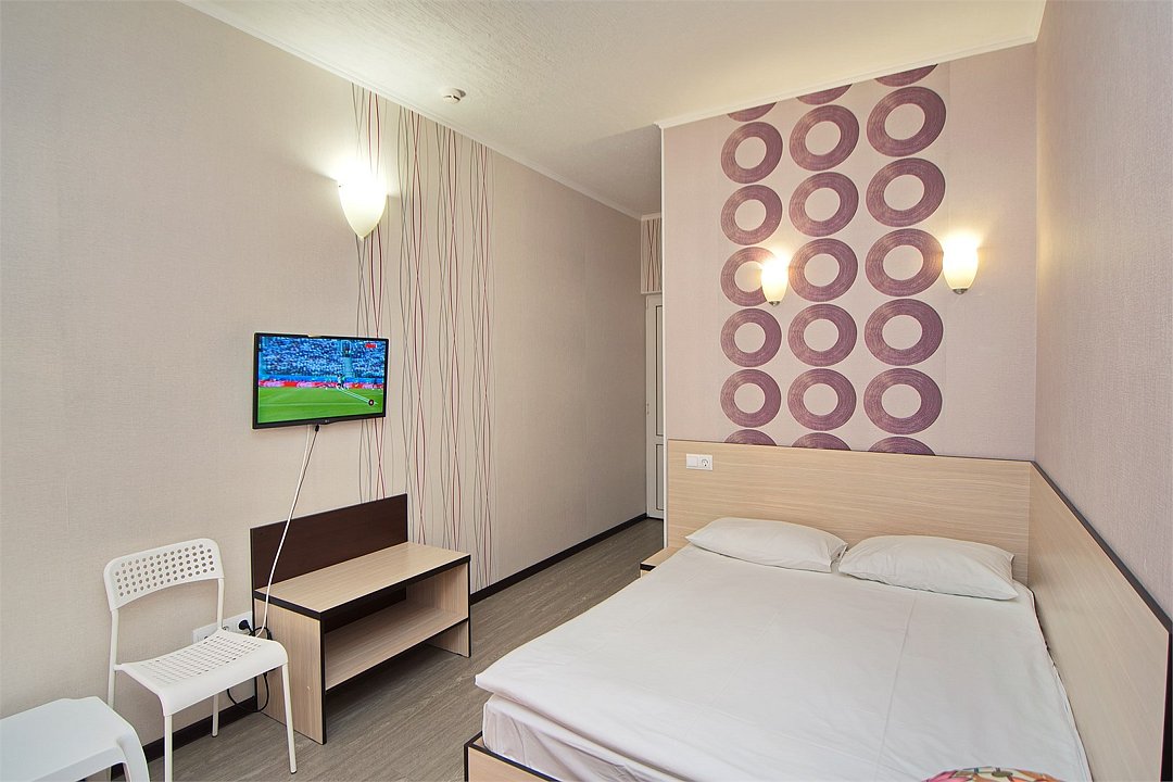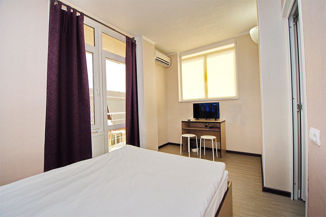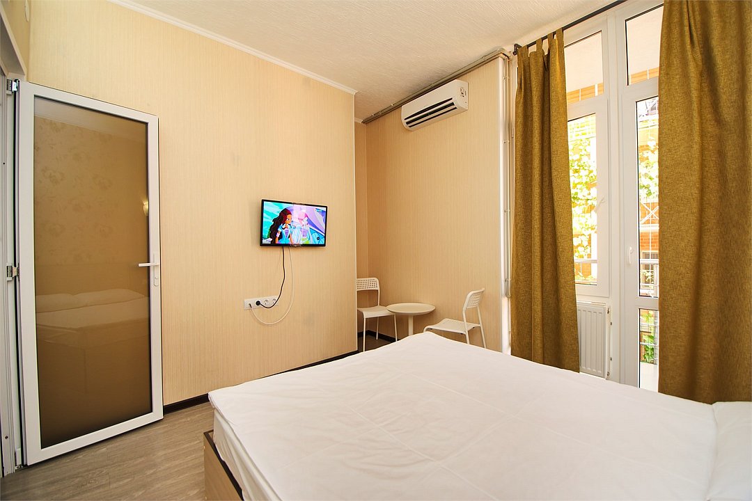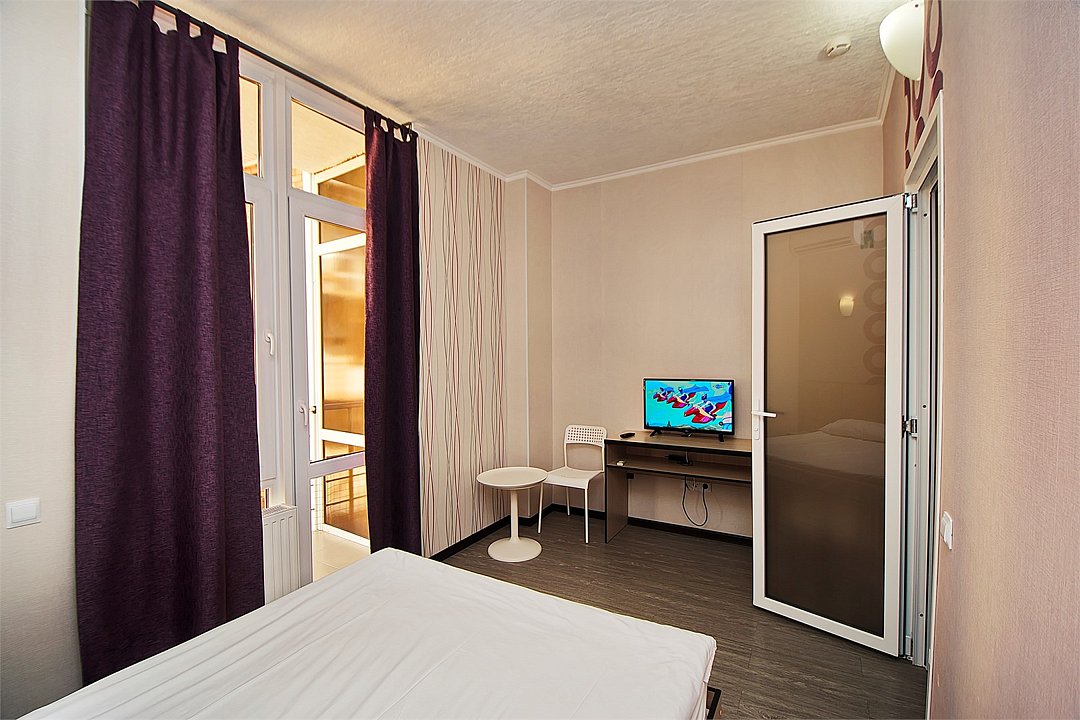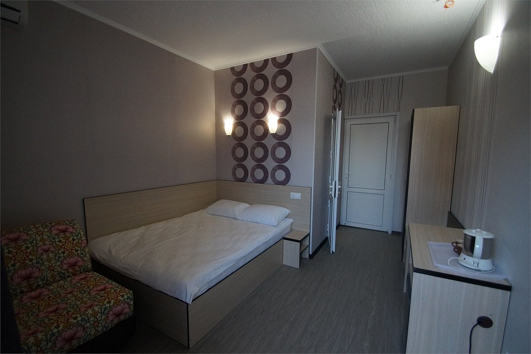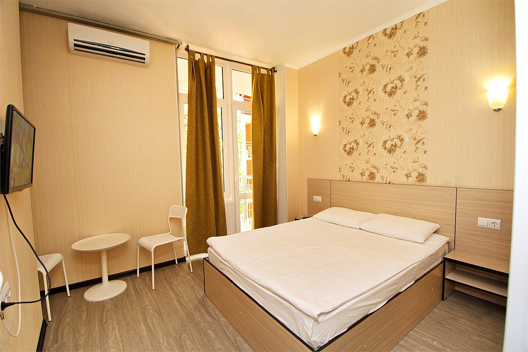 Стандартный номер для двоих с видом на море. В номере большая двуспальная кровать (1,6м*2м). Также есть балкон с мебелью. В номере есть все необходимое для комфортного проживания: с\у с душевой, раковиной и унитазом, сплит-система, мини-холодильник, WI-FI, ТВ на 20 каналов, прикроватная тумба, шкаф, стол, стул, чайник, фен, полотенца, мыльные принадлежностиУслуги и удобства